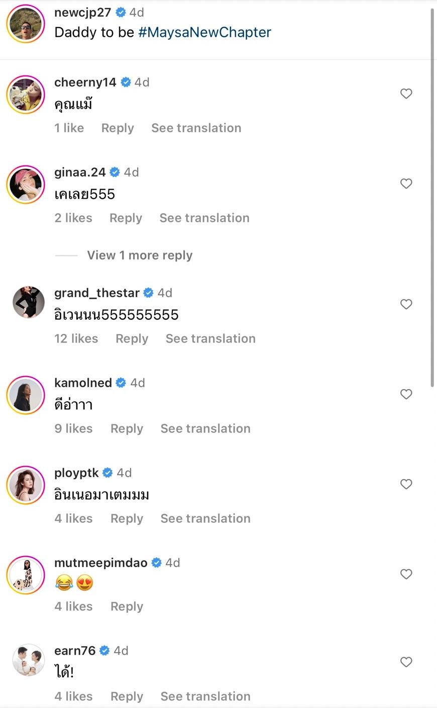 ทำเอาบรรดาคนในวงการบันเทิงแห่คอมเมนต์แซว อาทิ เชียร์ ฑิฆัมพร “คุณแม๊”, จีน่า วิรายา “เคเลย555” “อิเวนนน555555555”, พลอย ภัทรากร “อินเนอมาเตมมม”, อาย กมลเนตร “ดีอ่าาา” ฯลฯ