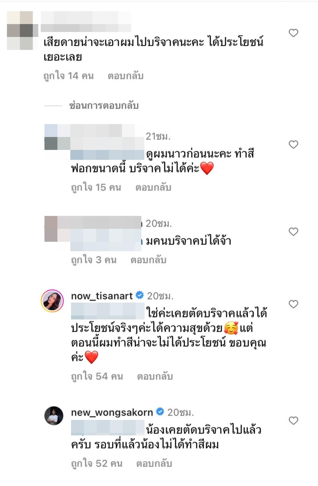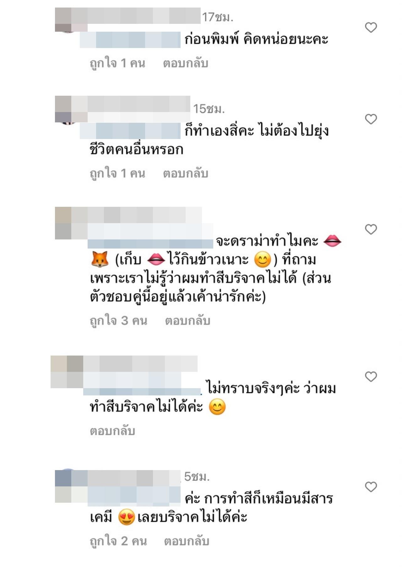 และหลายคนที่ติดตามก็ได้เข้ามาคอมเมนต์เพิ่มว่า ดูผมนาวก่อนนะคะ ทำสีฟอกขนาดนี้ บริจาคไม่ได้ค่ะ, ก็ทำเองสิ่คะ ไม่ต้องไปยุ่งชีวิตคนอื่นหรอก, ค่ะ การทำสีก็เหมือนมีสารเคมี เลยบริจาคไม่ได้ค่ะ, ทำไมต้อง บริจาคดีกว่านู่นนี่ อยากบริจาคอะไรก็ทำเองสิคะ บอกคนอื่นทำไม นักบุญทุนคนอื่นกันจริงๆ เป็นต้น.