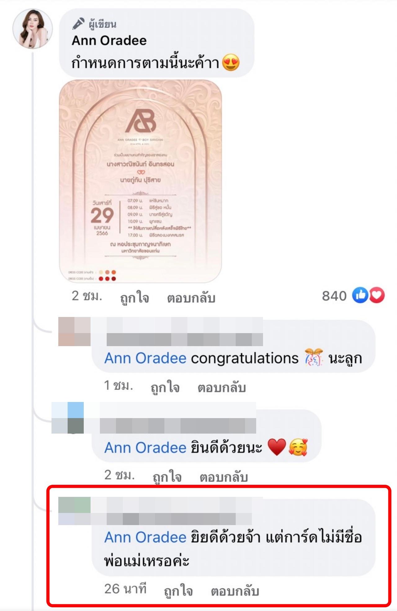 พร้อมกับโพสต์รูปการ์ดแต่งงาน โดยทั้งคู่ได้มีกำหนดจัดพิธีไทยในช่วงเช้า โดยมีพิธีแห่ขันหมาก สู่ขอ บายศรีสู่ขวัญ ผูกแขน และจัดงานฉลองมงคลสมรสในตอนเย็น ด้านแฟนๆ ที่ติดตามเข้ามาร่วมแสดงความยินดีจำนวนมาก แต่มีบางคนได้เข้ามาคอมเมนต์ถามว่า ทำไมในการ์ดแต่งงานถึงไม่มีชื่อของพ่อแม่เลย.