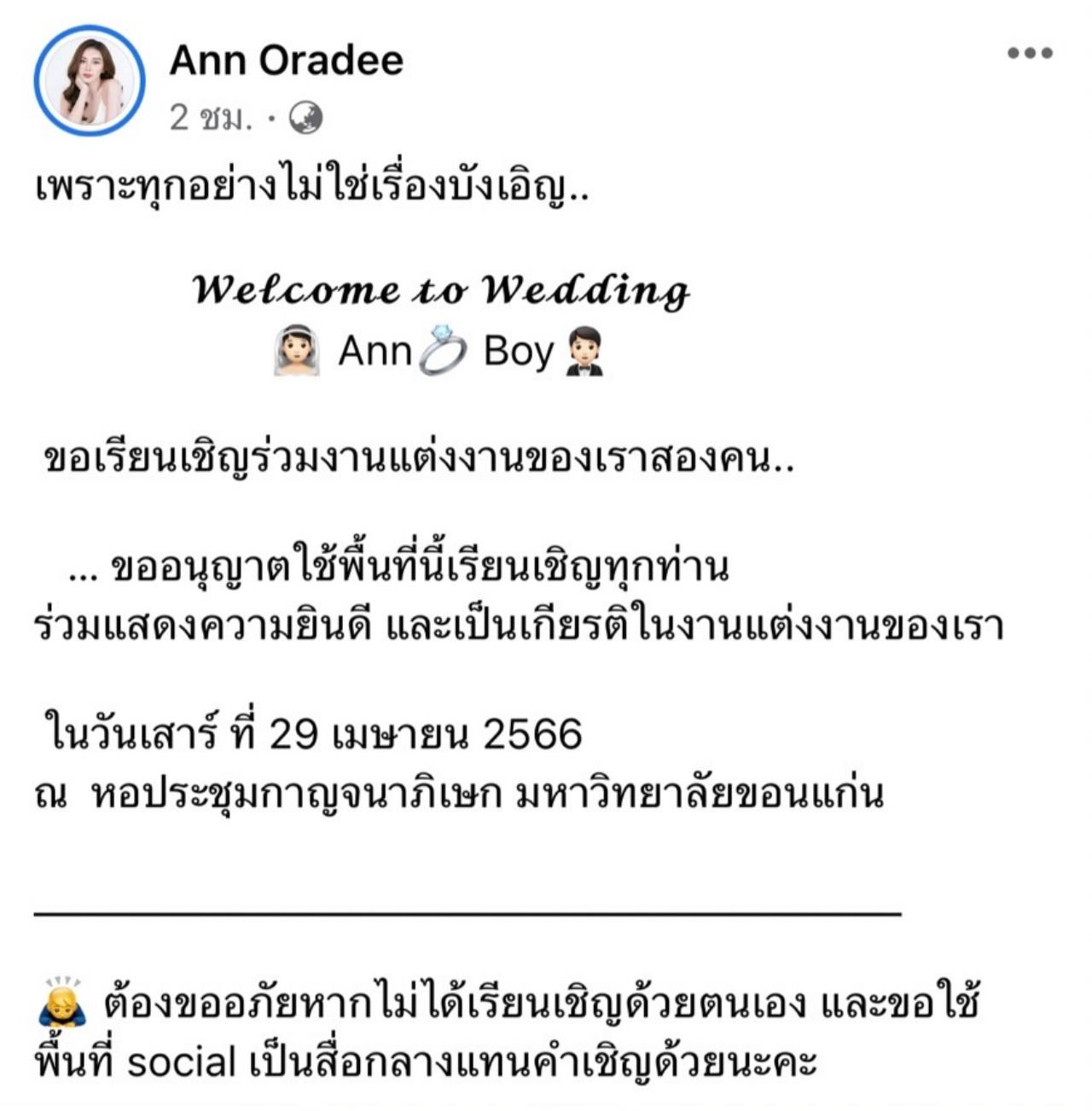 ล่าสุด แอน อรดี กับ บอย ศิริชัย ได้โพสต์การ์ดงานแต่งงาน พร้อมกับร่วมเชิญทุกคนมางานแต่งงาน โดยโพสต์ดังกล่าวระบุว่า