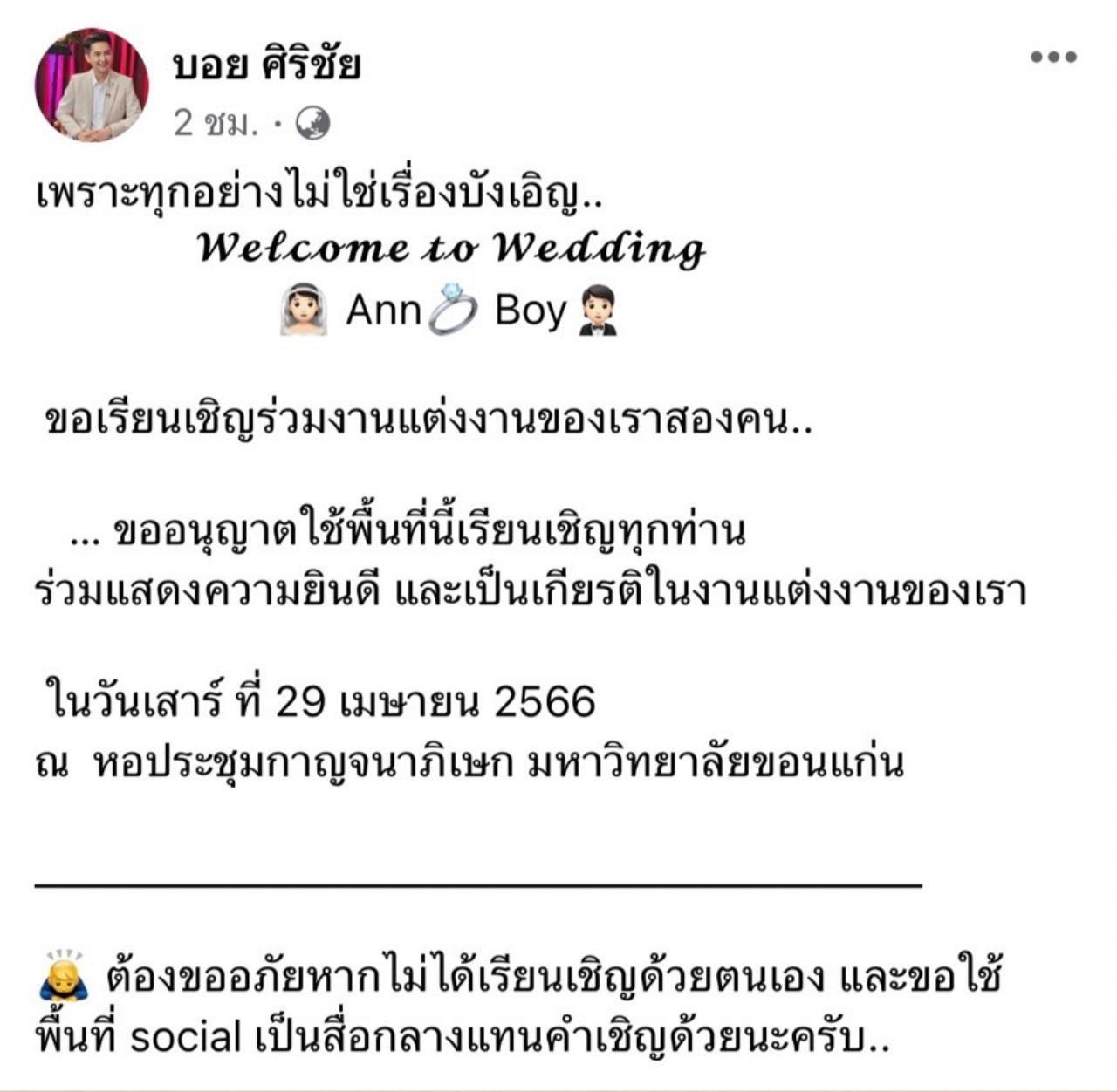 ร่วมแสดงความยินดี และเป็นเกียรติในงานแต่งงานของเรา ในวันเสาร์ ที่ 29 เมษายน 2566 ณ หอประชุมกาญจนาภิเษก มหาวิทยาลัยขอนแก่น ต้องขออภัยหากไม่ได้เรียนเชิญด้วยตนเอง และขอใช้พื้นที่ social เป็นสื่อกลางแทนคำเชิญด้วยนะคะ"