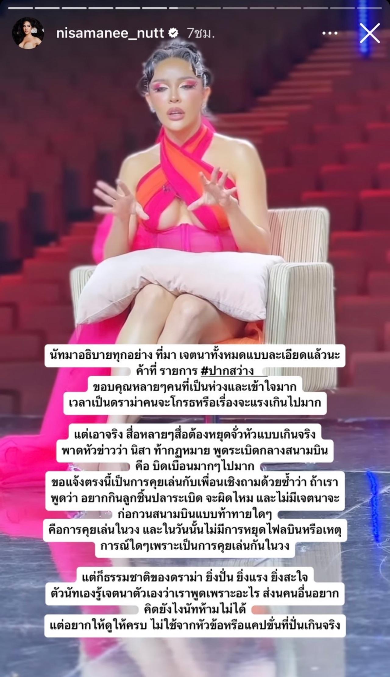 "นัทมาอธิบายทุกอย่าง ที่มา เจตนาทั้งหมดแบบละเอียดแล้วนะค้าที่ รายการ #ปากสว่าง เวลาเป็นดราม่าคนจะโกรธหรือเรื่องจะแรงเกินไปมาก ขอบคุณหลายๆ คน ที่เป็นห่วงและเข้าใจมาก แต่เอาจริง สื่อหลายๆ สื่อต้องหยุดจั่วหัวแบบเกินจริง พาดหัวข่าวว่า นิสา ท้ากฎหมาย พูดระเบิดกลางสนามบิน คือ บิดเบือนมากๆ ไปมาก