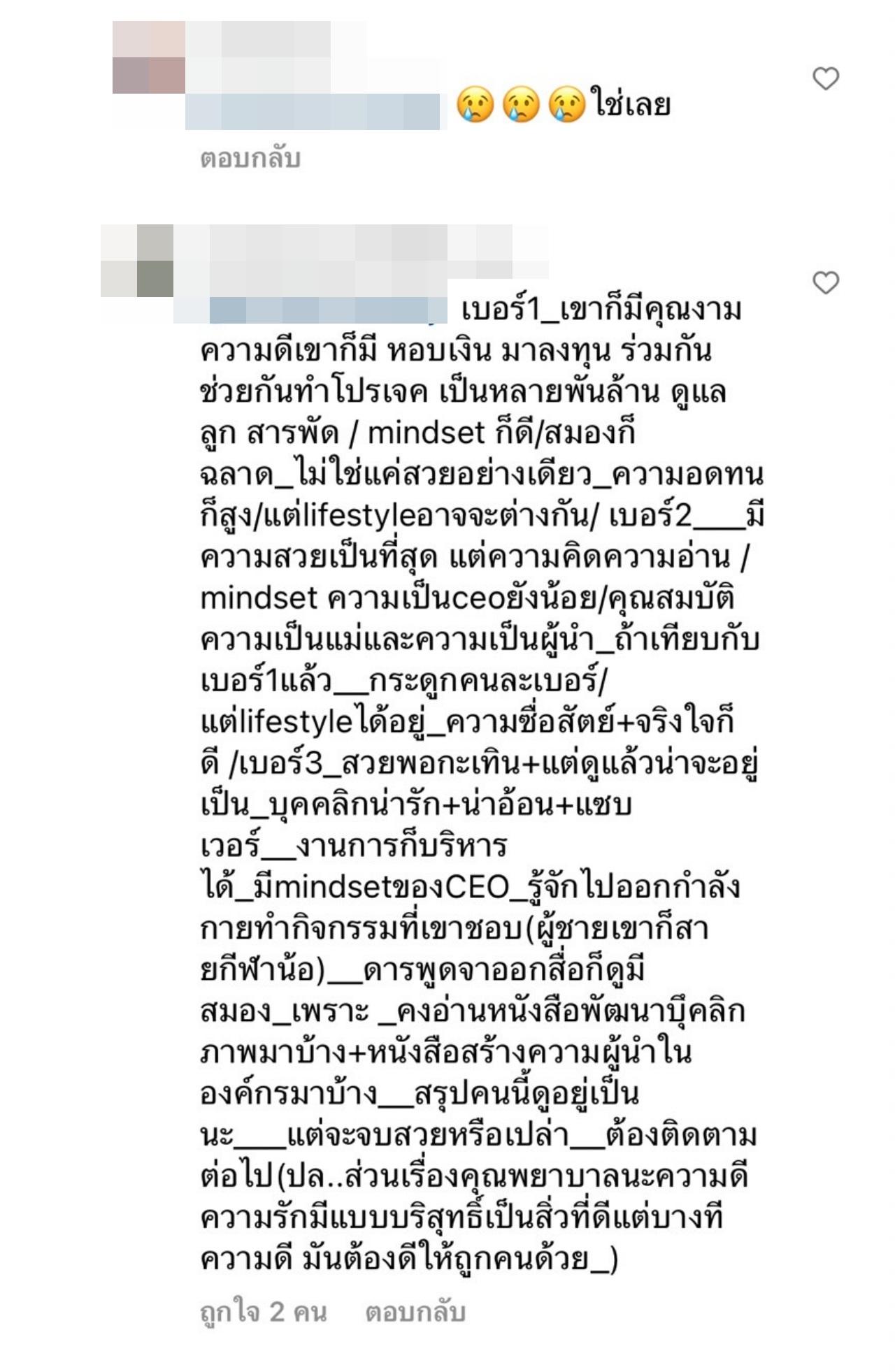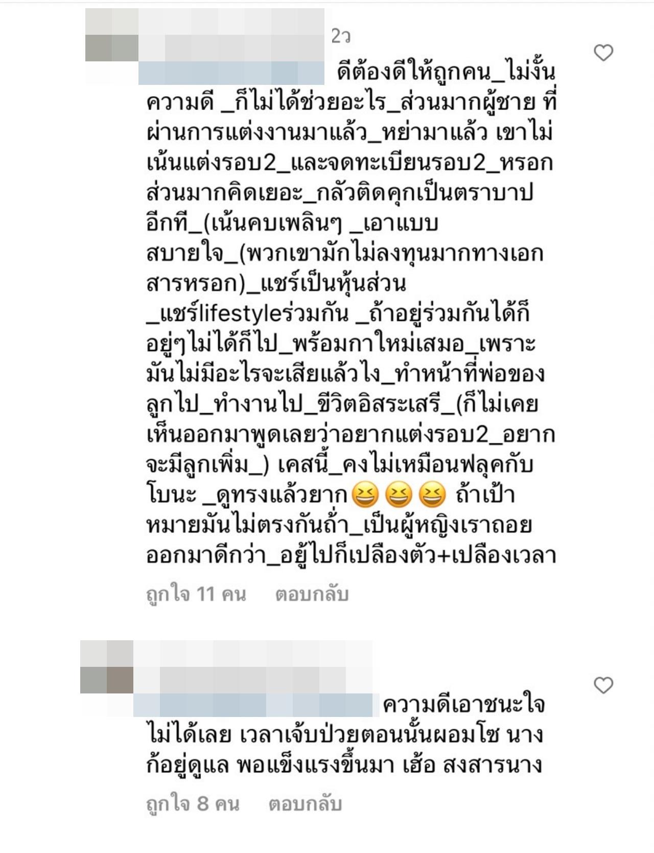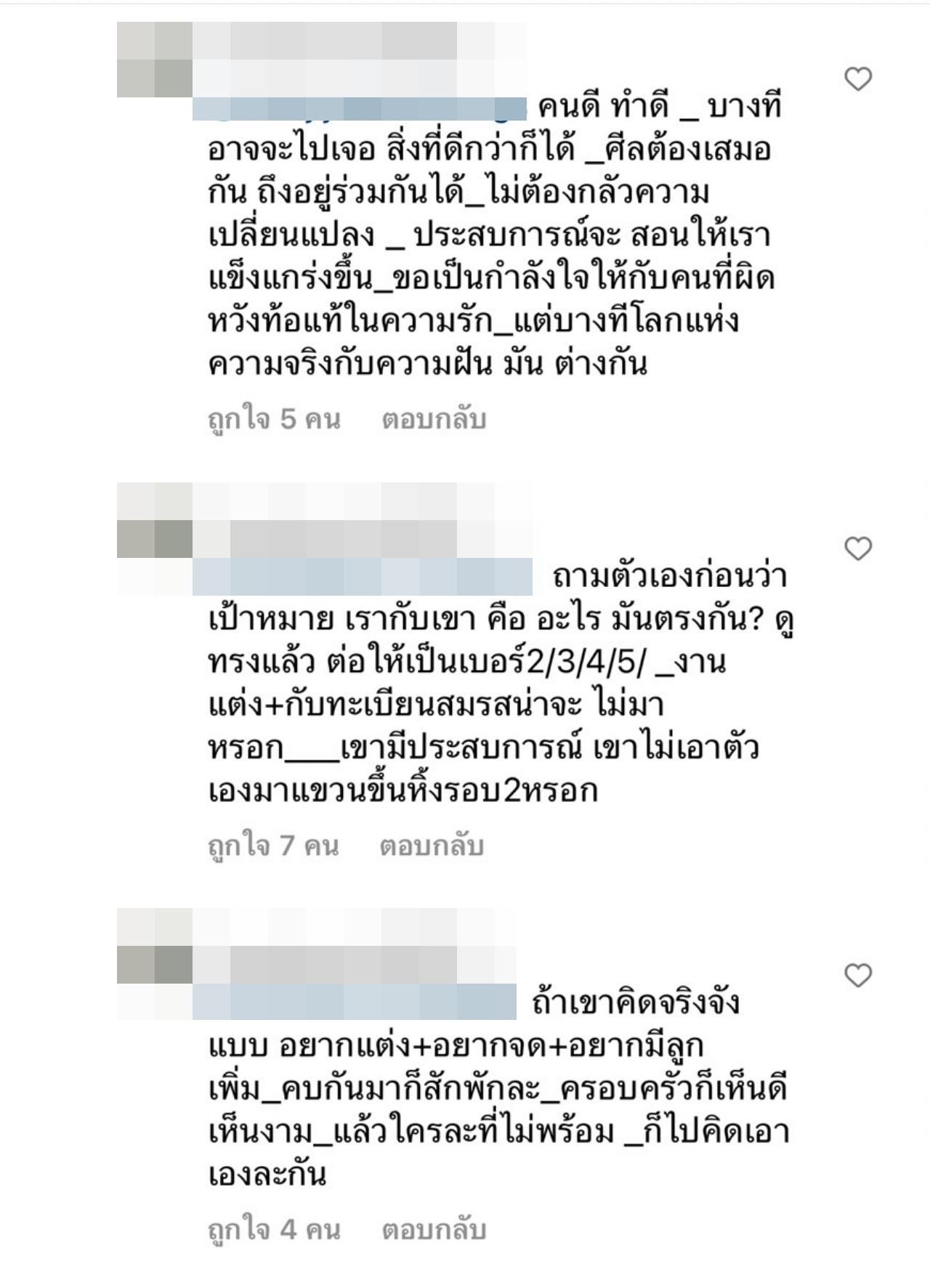 จากนั้นก็ได้มีคนเข้ามาคอมเมนต์เพิ่มเติมว่า ตอนเจาะคอแมทก็ดูเเล พอหายดีก็ …, นางยอมแลกอนาคต เสียงานเสียชื่อเสียง ไม่น่ามาจบแบบนี้นะ เห็นใจอยู่, ความดีเอาชนะใจไม่ได้เลย เวลาเจ็บป่วยตอนนั้นผอมโซ นางก็อยู่ดูแล พอแข็งแรงขึ้นมา เฮ้อ สงสารนาง, ถ้าเขาคิดจริงจัง แบบ อยากแต่ง+อยากจด+อยากมีลูกเพิ่ม_คบกันมาก็สักพักละ_ครอบครัวก็เห็นดีเห็นงาม_แล้วใครละที่ไม่พร้อม _ก็ไปคิดเอาเองละกัน เป็นต้น