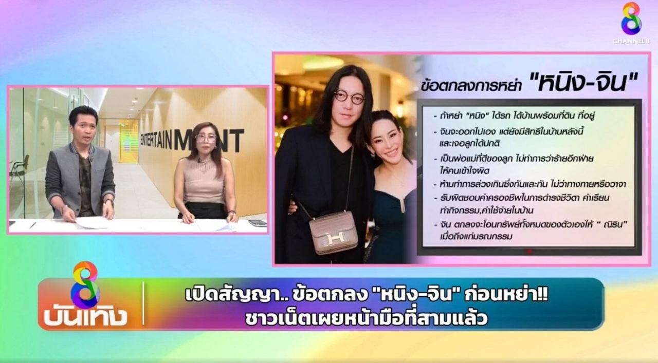 และทางด้านพิธีกรยังบอกอีกว่า ข้อตกลงนี้ไม่ได้เป็นสิ่งที่หนิงโอเค แต่เป็นสิ่งที่จินเสนอและขอหย่าเอง ทั้งหนิงและจินได้มีการเซ็นข้อตกลงนี้กันแล้ว รวมทั้งหมดประมาณ 10 ล้านบาท ที่แค่ 10 ล้านเพราะจินไม่ได้มีเงินอะไรมากมาย ทรัพย์สินที่เห็นเป็นของพ่อ หนิงเลยเอาแค่บ้านกับค่าเรียนของลูกก่อน เพราะส่ิงที่ทำสัญญามาทั้งหมด เหมือนจินให้ไม่ได้ เพราะจินไม่มี ซึ่งข้อตกลงดังกล่าวเป็นแค่การตกลงกัน แต่ยังไม่ได้เซ็นใบหย่า.