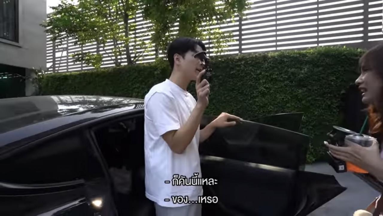ได้ยินแบบนี้นิกกี้ก็สงสัยใหญ่ ถามว่าจริงเหรอ ได้ฟรีเลยเหรอ ทำไมถึงได้ฟรีอะ เก๋ไก๋หัวเราะแทนคำตอบ ก่อนจะตอบแบบขำๆ ว่า “เพราะว่ามีบุญ ไม่เซ็งหรอก ถ้าเราได้รถมาไวกว่าคนอื่น มันก็ไม่มีอะไรอะ” นิกกี้ขอดูรถ เก๋ไก๋ ถามนิกกี้ว่า “ตอนนั้นที่...มามันก็ขับคันนี้ปะ ขับเทสลามาปะ ก็คันนี้แหละ” นิกกี้ถามว่าของ...เหรอ คนละสีไม่ใช่เหรอ เก๋ไก๋บอกให้ดูป้ายทะเบียน เอาอันนี้ไปลงเดี๋ยวคนก็ตัดลงใน TikTok กันเต็ม