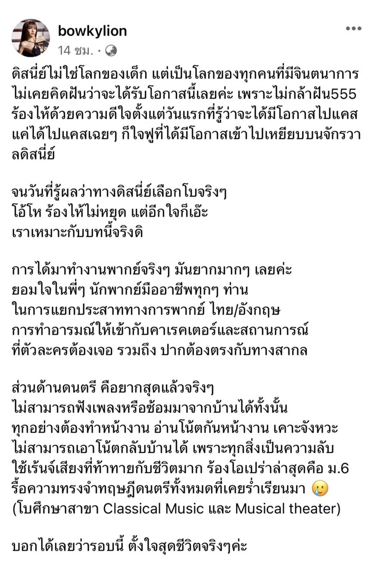 ด้วยความเป็นแฟนดิสนีย์อย่างสัตย์จริง ถึงโบจะได้รับโอกาสในครั้งนี้ จากการแคสต์ แต่สุดท้ายแล้วถ้าโอกาสนั้นๆ ไม่ได้เหมาะสมกับโบ โบเชื่อว่าตัวโบเองก็จะไม่ปล่อยให้ตัวเองได้รับโอกาสนั้นค่ะ แต่ครั้งนี้ โบขอน้อมรับโอกาสนี้ไว้ โบเชื่อใจในดิสนีย์และทีมจริงๆค่ะ ว่าได้เลือกในสิ่งที่เหมาะสมแล้ว