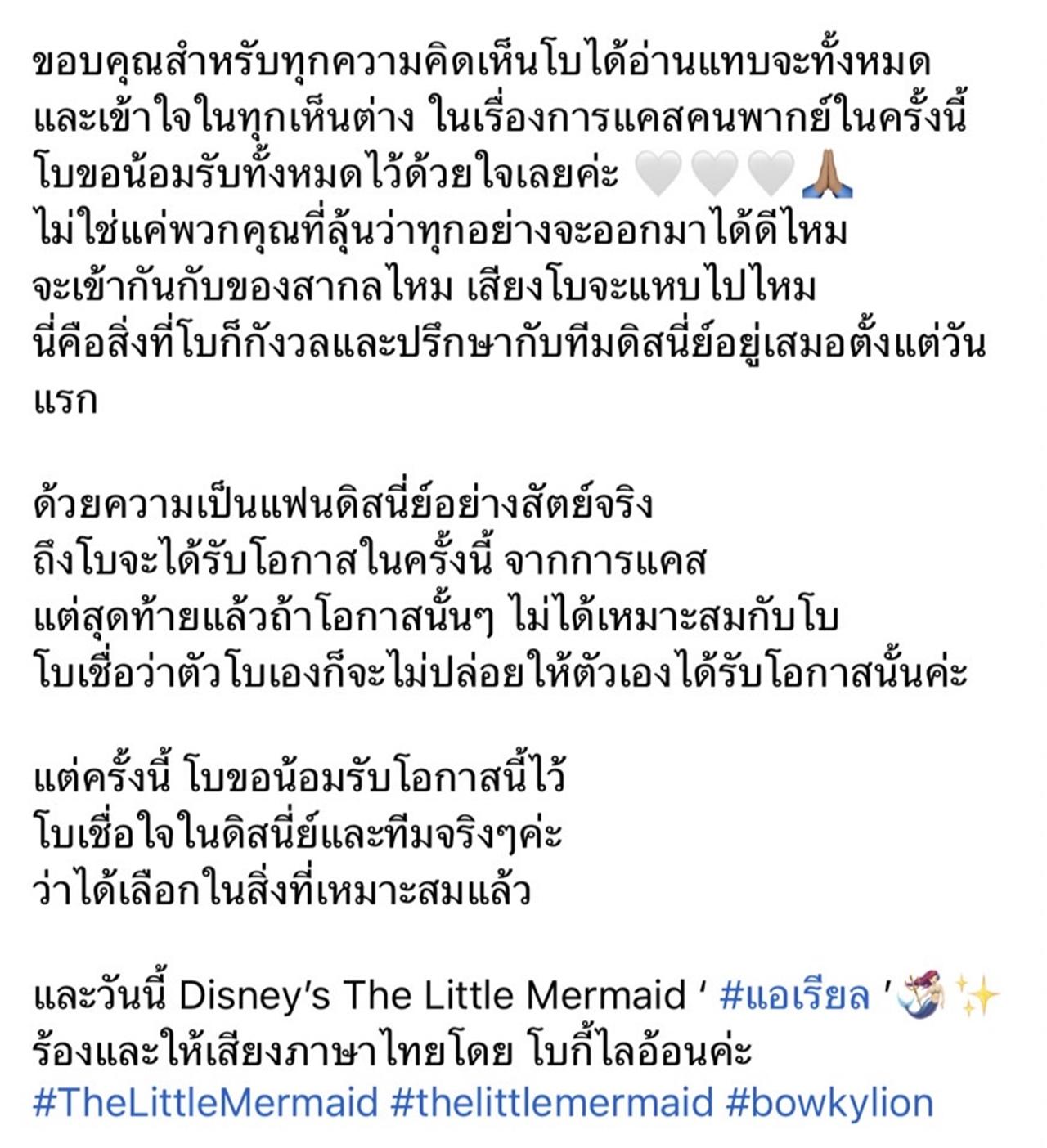 ขอบคุณสำหรับทุกความคิดเห็นโบได้อ่านแทบจะทั้งหมด และเข้าใจในทุกเห็นต่าง ในเรื่องการแคสต์คนพากย์ในครั้งนี้ โบขอน้อมรับทั้งหมดไว้ด้วยใจเลยค่ะ ไม่ใช่แค่พวกคุณที่ลุ้นว่าทุกอย่างจะออกมาได้ดีไหม จะเข้ากันกับของสากลไหม เสียงโบจะแหบไปไหม นี่คือสิ่งที่โบก็กังวลและปรึกษากับทีมดิสนีย์อยู่เสมอตั้งแต่วันแรก