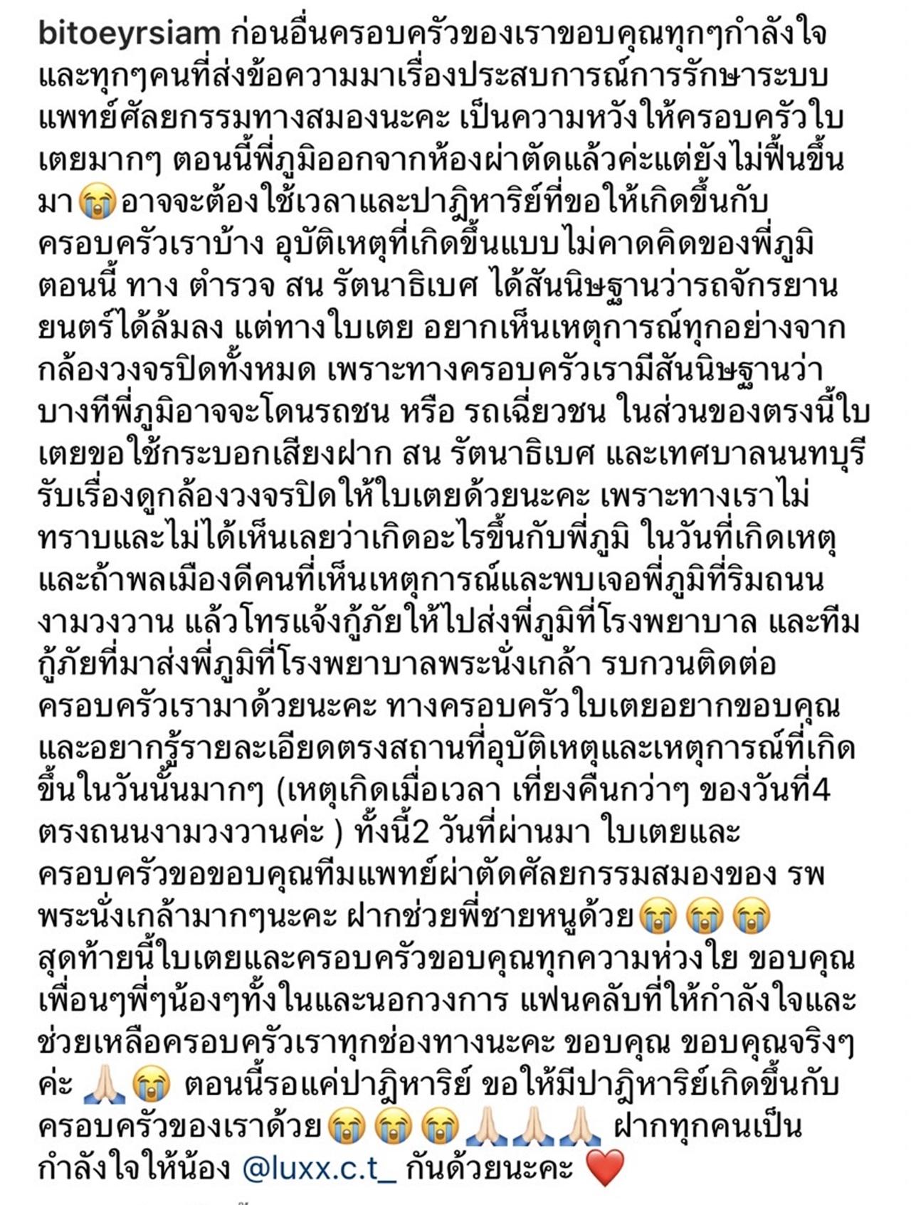 ตอนนี้พี่ภูมิออกจากห้องผ่าตัดแล้วค่ะแต่ยังไม่ฟื้นขึ้นมา อาจจะต้องใช้เวลาและปาฏิหาริย์ที่ขอให้เกิดขึ้นกับครอบครัวเราบ้าง อุบัติเหตุที่เกิดขึ้นแบบไม่คาดคิดของพี่ภูมิตอนนี้ ทาง ตำรวจ สน.รัตนาธิเบศร์ ได้สันนิษฐานว่ารถจักรยานยนต์ได้ล้มลง