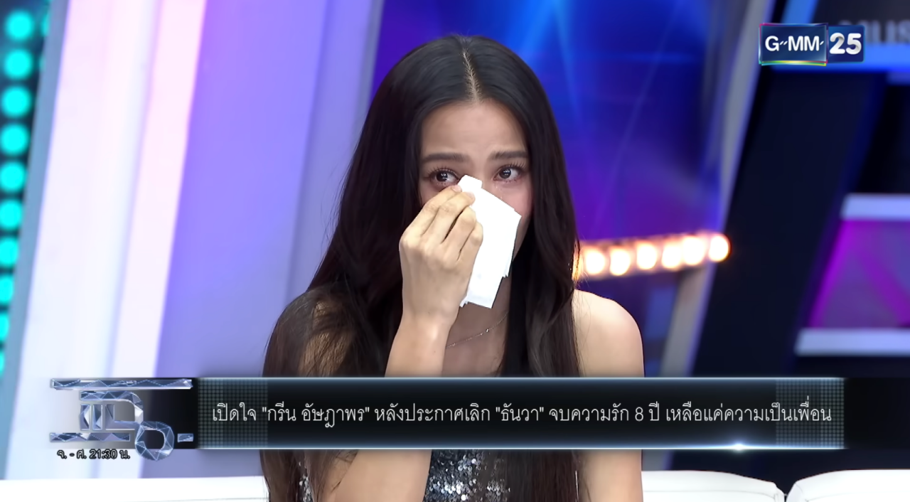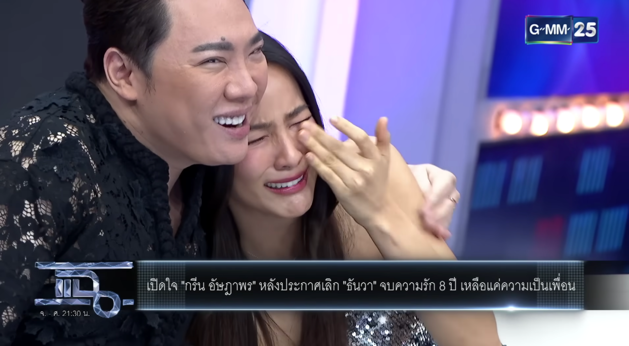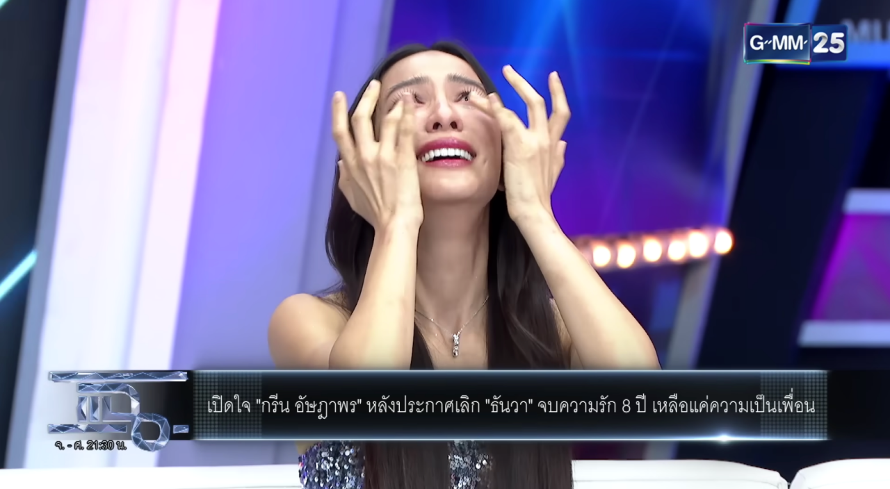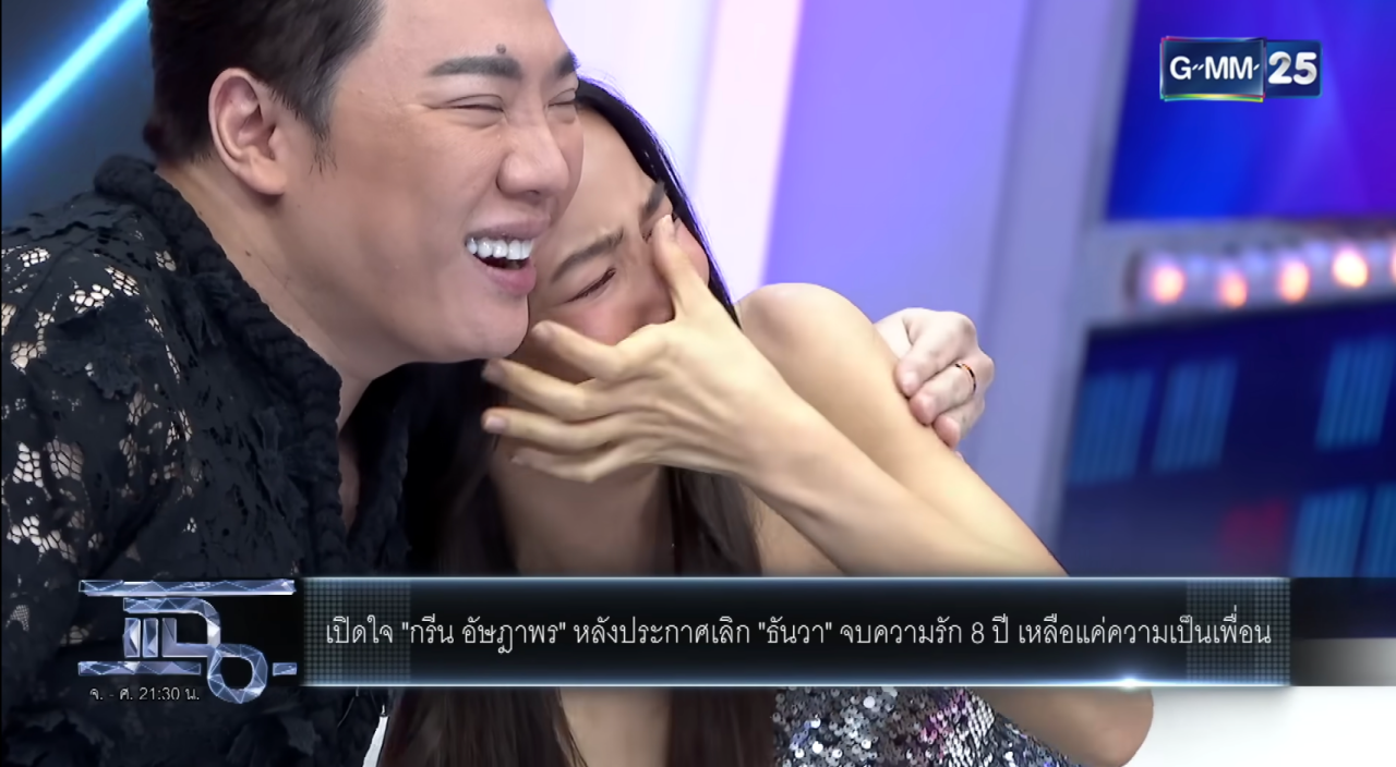 โดยล่าสุด กรีน ได้ออกมาเปิดเผยเรื่องราวที่ทำให้ความรักของทั้งคู่ไปต่อไม่ได้ในรายการแฉ ซึ่งในระหว่างที่พูดถึงอดีตคนรัก กรีนก็กลั้นน้ำตาเอาไว้ไม่อยู่ ก่อนจะร้องไห้ออกมากลางรายการสด