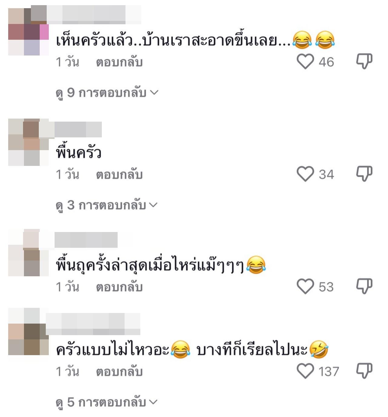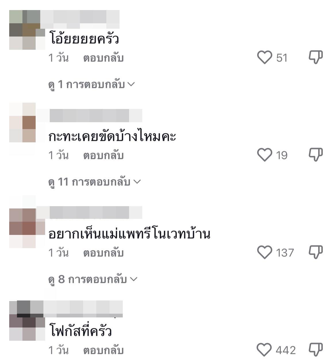 ก่อนจะวิจารณ์ครัวของนักแสดงสาวว่า "กวาดใต้เตาหน่อยไหมคุณแม่, ครัวแบบไม่ไหวอะ บางทีก็เรียลไปนะ, เห็นครัวแล้ว..บ้านเราสะอาดขึ้นเลย.., พื้นถูครั้งล่าสุดเมื่อไหร่แม๊ๆๆๆ, กระทะเคยขัดบ้างไหมคะ, กวาดใต้เตาหน่อยมั้ยคุณแม่, ใช่ สกปรกมากมีแต่คราบ แพทเอ้ย, โฟกัสที่ครัว"