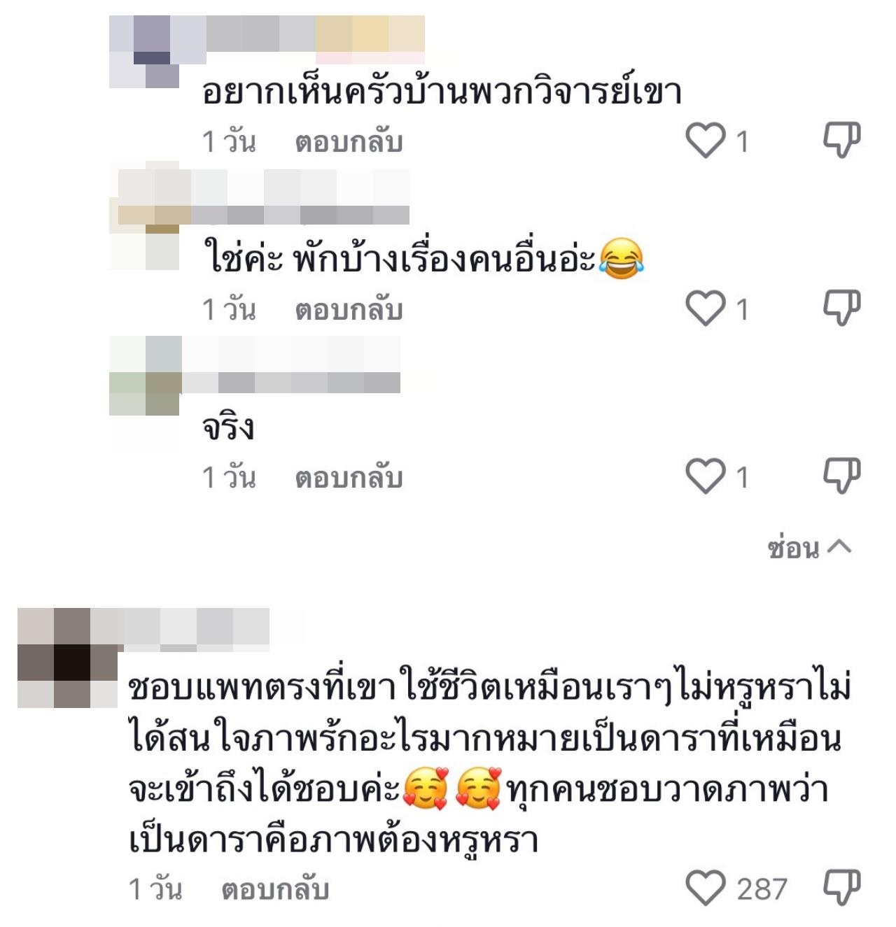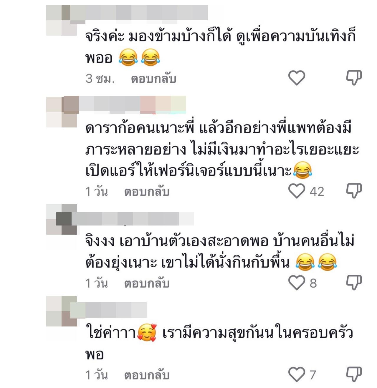 แต่งานนี้ก็มีชาวเน็ตบางกลุ่ม เข้ามาคอมเมนต์ตอบกลับคนที่วิจารณ์เรื่องครัวของสาวแพทเช่นกันว่า "ชอบแพทตรงที่เขาใช้ชีวิตเหมือนเราๆ ไม่หรูหราไม่ได้สนใจภาพลักษณ์อะไรมากมาย เป็นดาราที่เหมือนจะเข้าถึงได้ ชอบค่ะ ทุกคนชอบวาดภาพว่าเป็นดาราคือภาพต้องหรูหรา, กรมอนามัยเต็มเลย บางทีก็มองผ่านบ้างก็ได้เนอะ ชีวิตจะได้มีความสุข, ครัว ก็คือครัวค่ะ จะให้เป็นห้องนอนได้ไงคะ แค่มีอาหาร อร่อย สะอาด ก็โอเคแล้วค่ะ ชอบคุณแพทค่ะ อยู่ง่ายๆๆ ไม่ต้องหรูหรา"