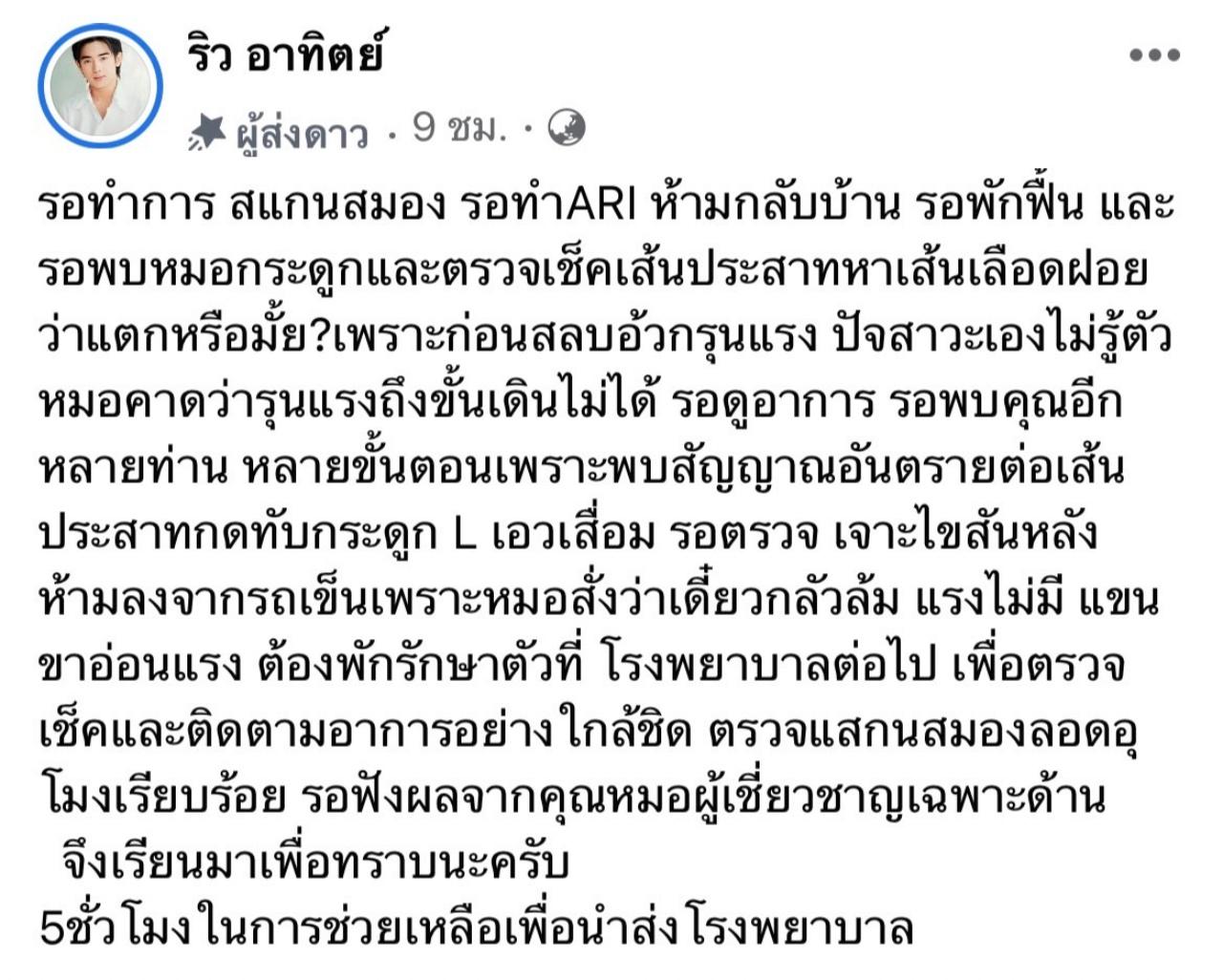 ล่าสุด อาทิตย์ ริว ได้อัปเดตอาการป่วยของตัวเองผ่านทางเฟซบุ๊ก เพื่อให้คนที่รักและเป็นห่วงได้ทราบเกี่ยวกับอาการของตัวเองว่า "รอทำการ สแกนสมอง รอทำ ARI ห้ามกลับบ้าน รอพักฟื้น และรอพบหมอกระดูกและตรวจเช็กเส้นประสาทหาเส้นเลือดฝอยว่าแตกหรือมั้ย? เพราะก่อนสลบอ้วกรุนแรง ปัสสาวะเองไม่รู้ตัว