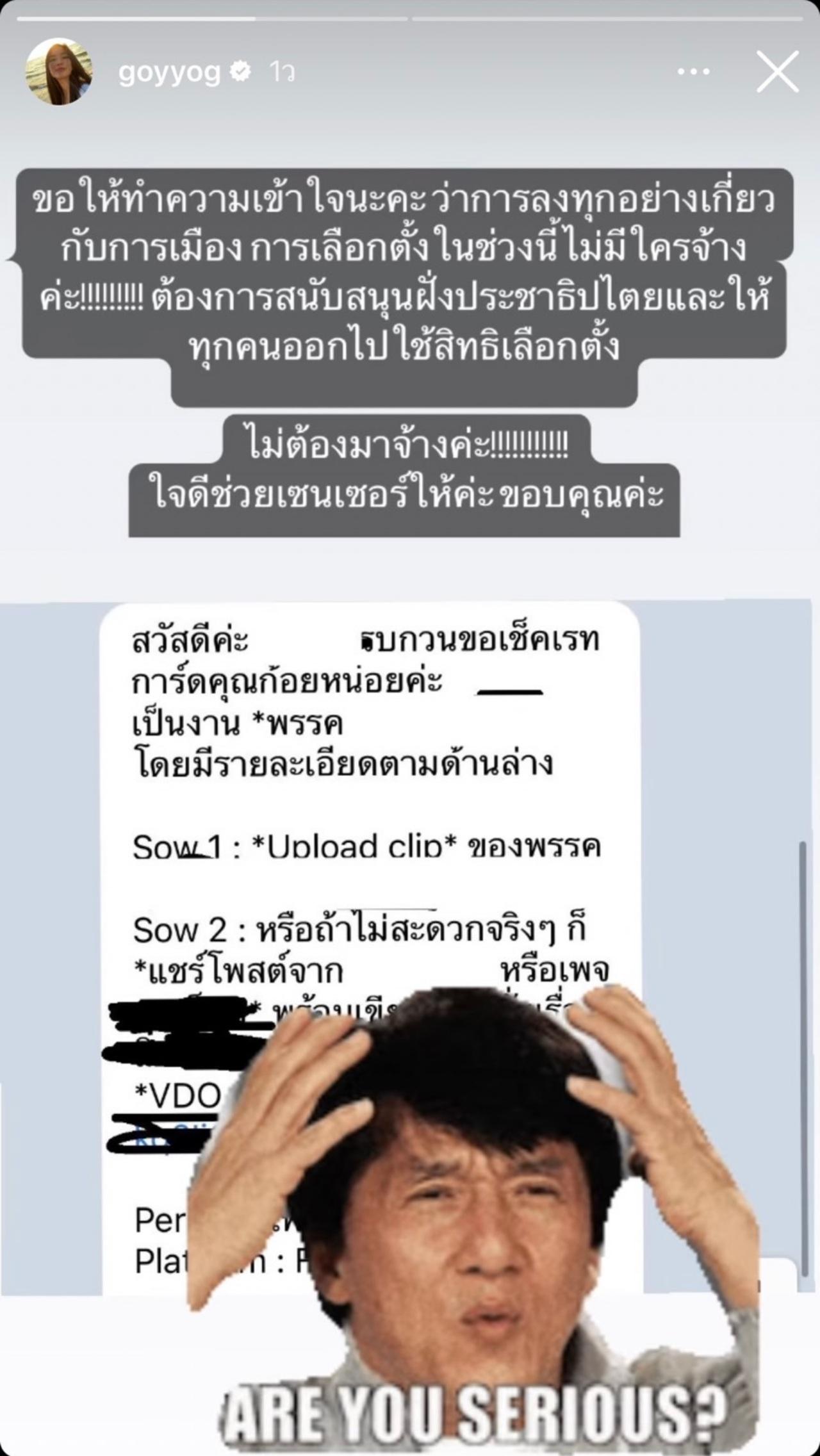 "ขอให้ทำความเข้าใจนะคะ ว่าการลงทุกอย่างเกี่ยวกับการเมือง การเลือกตั้งในช่วงนี้ ไม่มีใครจ้างค่ะ !!!!!! ต้องการสนับสนุนฝั่งประชาธิปไตยและให้ทุกคนออกไปใช้สิทธิเลือกตั้ง ไม่ต้องมาจ้างค่ะ!!!!!!!!!!!!!!! ใจดีช่วยเซนเซอร์ให้ค่ะ ขอบคุณค่ะ".
