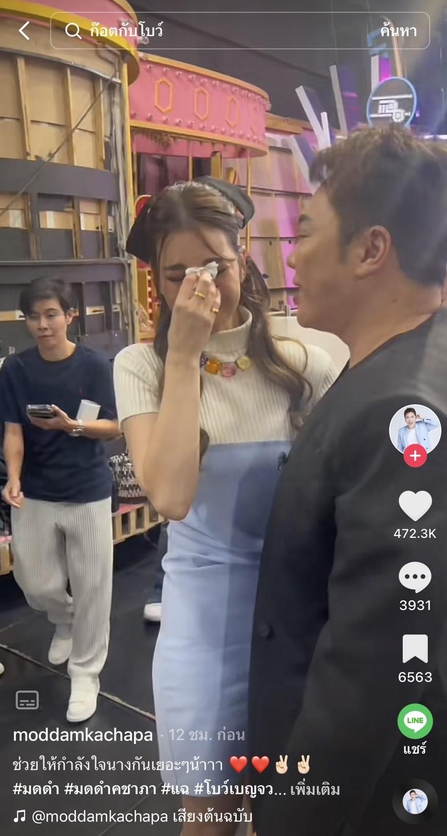 ล่าสุด มดดำ คชาภา ตันเจริญ พิธีกรฝีปากกล้า ได้โพสต์คลิปเบื้องหลังตอนที่ โบว์ เบญจวรรณ ยืนร้องไห้หลังกล้องไม่หยุด ก่อนที่มดดำจะเดินเข้าไปกอดปลอบให้กำลังใจโบว์พร้อมทั้งบอกว่าหยุดร้องได้แล้ว และถามว่าไหวมั้ย ซึ่งโบว์ก็ส่ายหน้าเป็นคำตอบว่าไม่ไหว ก่อนที่มดดำจะกอดโบว์ที่ยังร้องไห้อยู่อีกครั้งและบอกว่า “โตแล้วไม่ร้องแล้ว” และช่วยเอากระดาษมาซับน้ำตาให้โบว์ และมดดำก็เขียนแคปชั่นว่า “ช่วยให้กำลังใจนางกันเยอะๆ น้าาา”