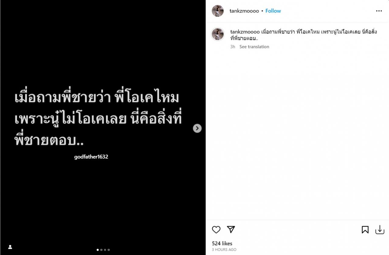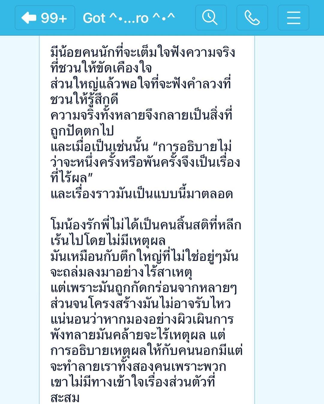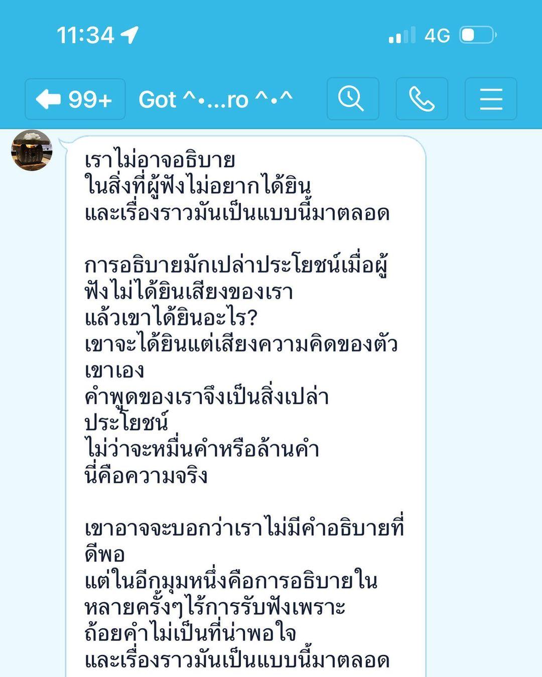 ล่าสุด มีผู้ใช้ไอจี @tankzmoooo ได้โพสต์ภาพข้อความที่เขียนว่า “เมื่อถามพี่ชายว่า พี่โอเคไหม เพราะนู๋ไม่โอเคเลย นี่คือสิ่งที่พี่ชายตอบ” รวมถึงภาพไลน์แชตสนทนาจาก ก๊อต จิรายุ ซึ่งส่งข้อความบอกว่า “เราไม่อาจอธิบายในสิ่งที่ผู้ฟังไม่อยากได้ยิน และเรื่องราวมันเป็นแบบนี้มาตลอด การอธิบายมักเปล่าประโยชน์เมื่อผู้ฟังไม่ได้ยินเสียงของเรา แล้วเขาได้ยินอะไร? เขาจะได้ยินแต่เสียงความคิดของตัวเขาเอง คำพูดของเราจึงเป็นสิ่งเปล่าประโยชน์ ไม่ว่าจะหมื่นคำหรือล้านคำ นี่คือความจริง