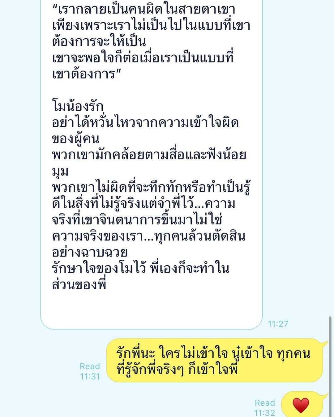 โมน้องรัก อย่าได้หวั่นไหวจากความเข้าใจผิดของผู้คน พวกเขามักคล้อยตามสื่อและฟังน้อยมุม พวกเขาไม่ผิดที่จะทึกทักหรือทำเป็นรู้ดีในสิ่งที่ไม่รู้จริงแต่จำพี่ไว้...ความจริงที่เขาจินตนาการขึ้นมาไม่ใช่ความจริงของเรา...ทุกคนล้วนตัดสินอย่างฉาบฉวย รักษาใจของโมไว้ พี่เองก็จะทำในส่วนของพี่”.