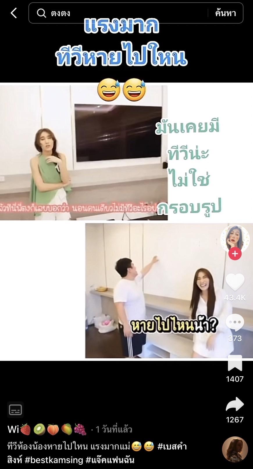 ล่าสุด แจ็ค แฟนฉัน นักแสดงหนุ่มอารมณ์ดี ก็ได้ไปร่วมรายการยูทูบของเบสท์ และมีช่วงหนึ่งที่แจ็คเข้าไปที่ห้องนอนของเบสท์ ก่อนจะสังเกตเห็นว่าทีวีหายไป ซึ่งแจ็คก็ทักเบสท์ตรงๆ ว่า “น้องผมขาดทีวีจอใหญ่ ใครมาเป็นสปอนเซอร์มาให้น้องหน่อย ผมอยากให้น้องผมมีทีวีจอใหญ่ เอ๊ะแต่มันหายไปไหนน้า” ซึ่งเบสท์ก็ไม่ได้ตอบอะไรนอกจากหัวเราะและพูดว่า “แรงมาก” ก่อนจะพูดอีกว่า “ช่างมันเถอะ” (ชมคลิป)