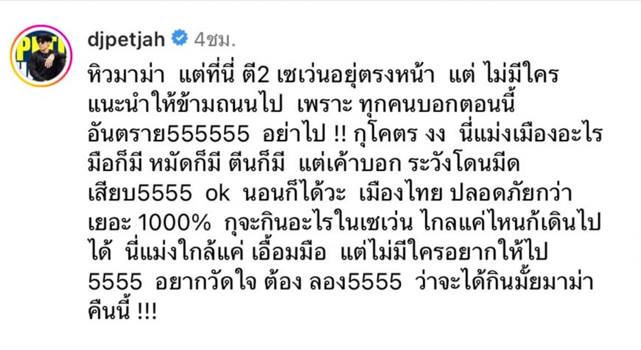 "หิวมาม่า แต่ที่นี่ ตี2 เซเว่นอยู่ตรงหน้า แต่ ไม่มีใคร แนะนำให้ข้ามถนนไป เพราะ ทุกคนบอกตอนนี้อันตราย555555 อย่าไป !! กุโคตร งง นี่แม่งเมืองอะไร มือก็มี หมัดก็มี ตีนก็มี แต่เค้าบอก ระวังโดนมีดเสียบ5555 ok นอนก็ได้วะ เมืองไทย ปลอดภัยกว่าเยอะ 1000% กุจะกินอะไรในเซเว่น ไกลแค่ไหนก้เดินไปได้ นี่แม่งใกล้แค่ เอื้อมมือ แต่ไม่มีใครอยากให้ไป 5555 อยากวัดใจ ต้อง ลอง5555 ว่าจะได้กินมั้ยมาม่าคืนนี้ !!!"