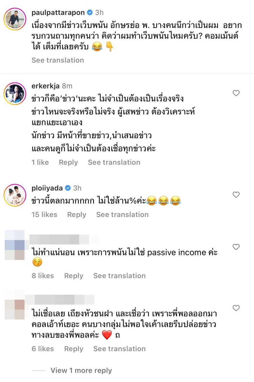 อีกทั้งยังมีแฟนๆ คอมเมนต์ อาทิ ไม่ทำแน่นอน เพราะการพนันไม่ใช่ passive income, ไม่เชื่อเลย เถียงหัวชนฝา และเชื่อว่าเพราะพี่พอลออกมาคอลเอาต์เยอะ คนบางกลุ่มไม่พอใจเค้าเลยรีบปล่อยข่าวทางลบของพี่พอลค่ะ, ถ้าหากเป็นคนที่ติดตามพี่ จะรู้ว่าพี่ไม่ทำแบบนั้นแน่นอนค่ะ, ไม่ใช่คุณพอลแน่นอนล้าน%, มีคลิปนึงที่คุณพอลห้ามลงทุนกับสิ่งนี้คือการพนัน เอ๊ะ เจ้าของเว็บพนันห้ามลงทุนในพนันเด็ดขาดดด อะไรกันเนี่ยย ตลกมาก ฯลฯ