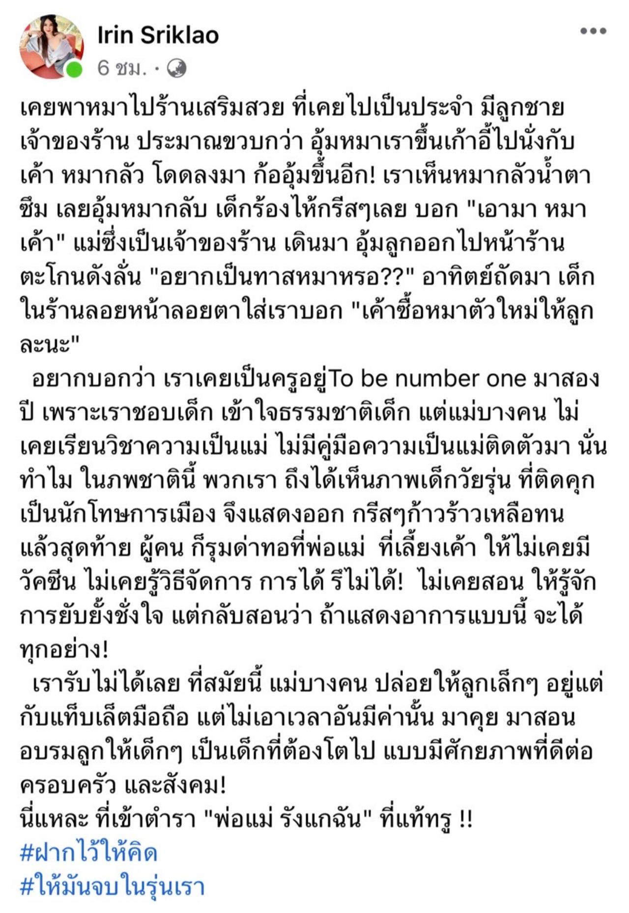 อยากบอกว่า เราเคยเป็นครูอยู่ To be number one มาสองปี เพราะเราชอบเด็ก เข้าใจธรรมชาติเด็ก แต่แม่บางคน ไม่ได้มีวิชาความเป็นแม่ ไม่มีคู่มือความเป็นแม่ติดตัวมา นั่นทำไมในภพชาตินี้ พวกเราถึงได้เห็นภาพเด็กวัยรุ่นที่ติดคุก เป็นนักโทษการเมือง จึงแสดงออก กรี๊ดๆ ก้าวร้าวเหลือทน