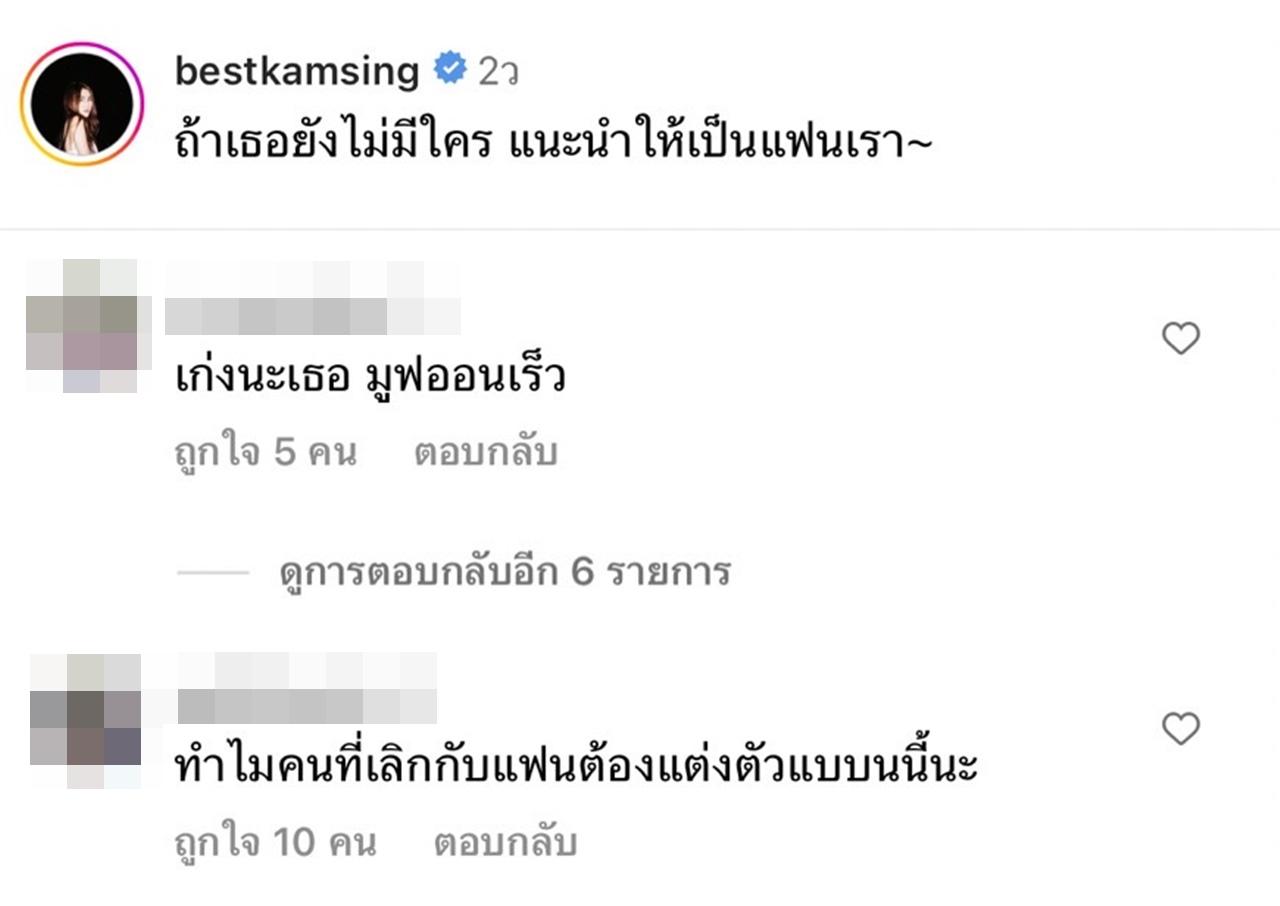 ล่าสุด เบสท์ ก็ได้โพสต์ภาพตัวเองในลุคสดใส พร้อมแคปชั่นว่า "ถ้าเธอยังไม่มีใคร แนะนำให้เป็นแฟนเรา" ซึ่งแฟนๆ หลายคนที่ติดตามต่างเข้ามาชื่นชมในความน่ารัก ความสดใส และชมว่า เบสท์ สวยขึ้นมากหลังกลับมาโสดอีกครั้ง
