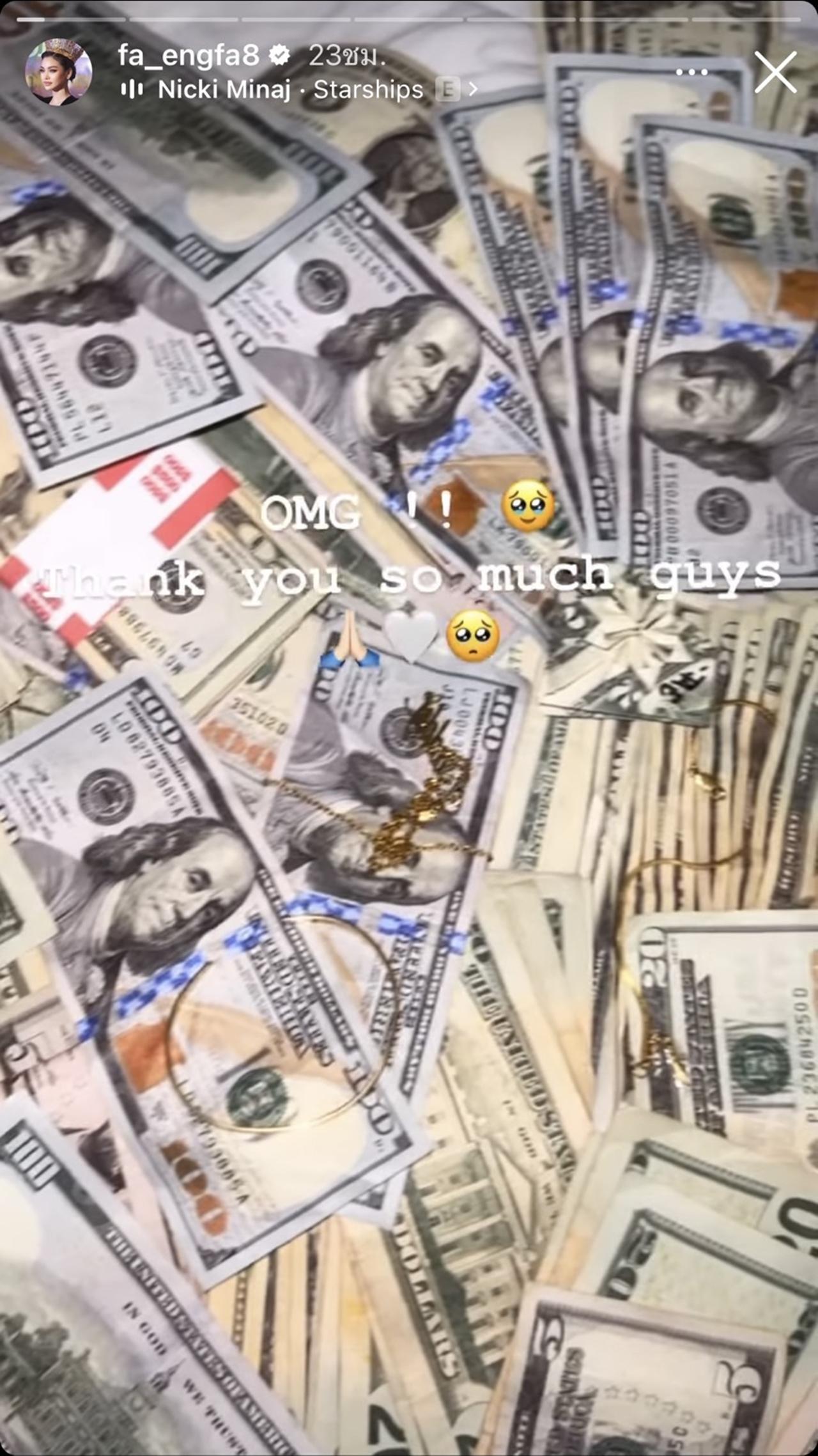ล่าสุดในไอจีสตอรี่ของ อิงฟ้า ก็ทำเอาตาลุกวาวเลยทีเดียว เมื่อเจ้าตัวได้โพสต์คลิปกองเงินสกุลดอลลาร์กองโต พร้อมข้อความว่า "OMG!! Thank you so much guys" ซึ่งในกองนั้นนอกจากจะมีเงินแล้ว ยังมีสร้อยทองอีกหลายเส้นวางอยู่ด้วย