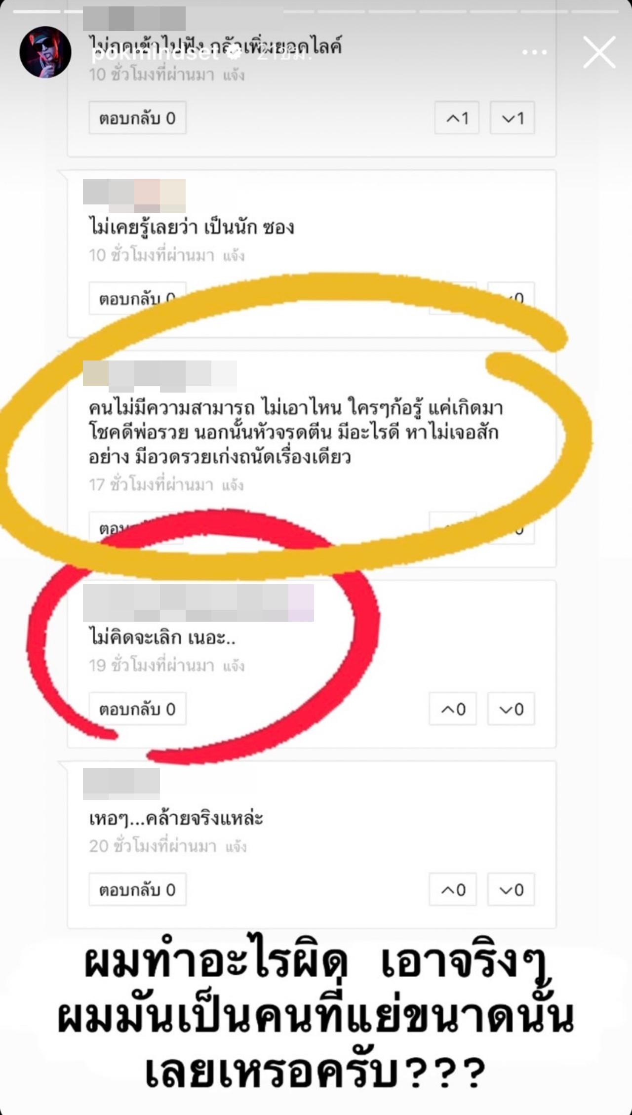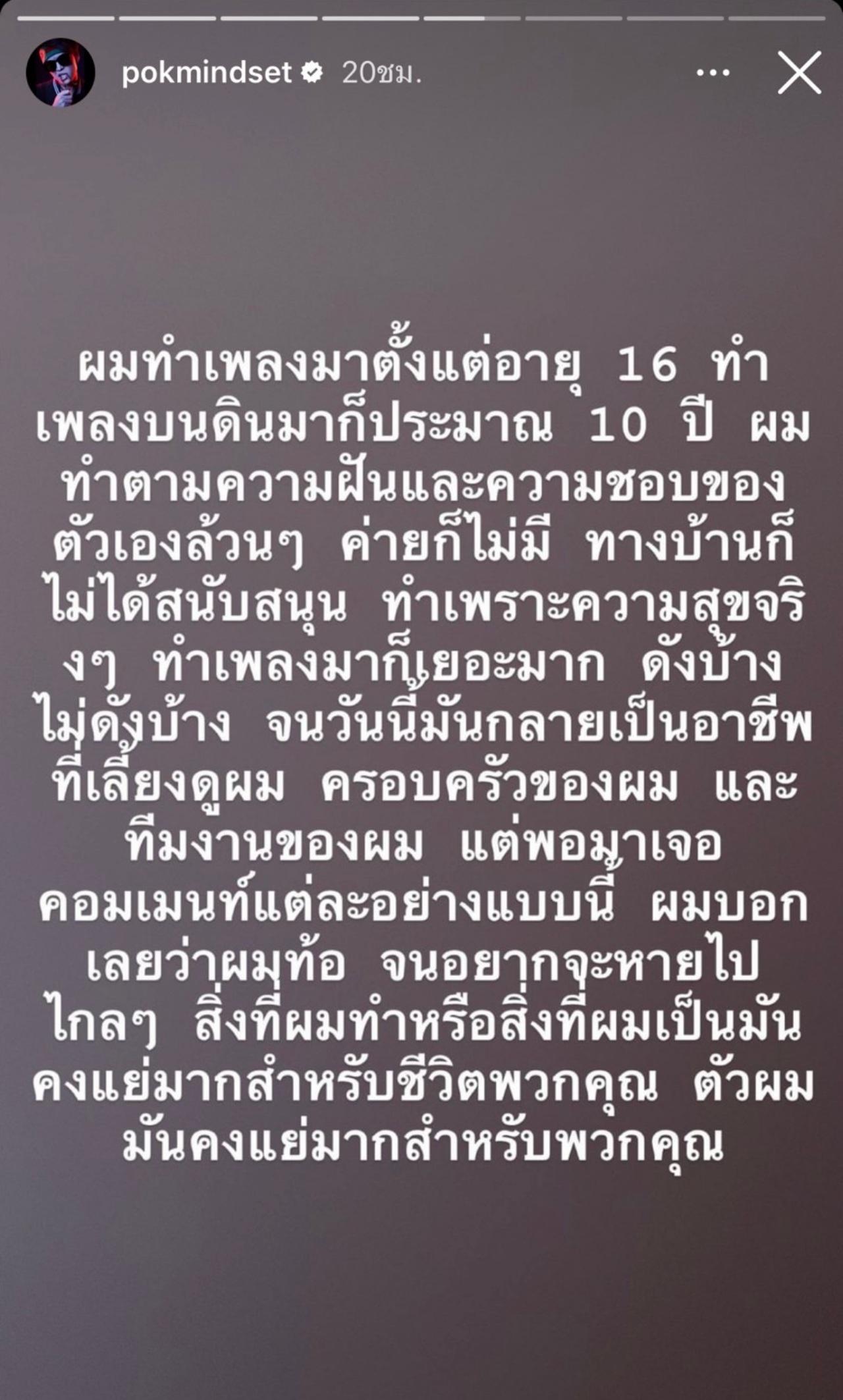 "ผมทำเพลงมาตั้งแต่อายุ 16 ทำเพลงบนดินมาก็ประมาณ 10 ปี ผมทำตามความฝันและความชอบของตัวเองล้วนๆ ค่ายก็ไม่มี ทางบ้านก็ไม่ได้สนับสนุน ทำเพราะความสุขจริงๆ ทำเพลงมาก็เยอะมาก ดังบ้าง ไม่ดังบ้าง จนวันนี้มันกลายเป็นอาชีพที่เลี้ยงดูผม ครอบครัวของผม และทีมงานของผม แต่พอมาเจอคอมเมนต์แต่ละอย่างแบบนี้ ผมบอกเลยว่าผมท้อ จนอยากจะหายไปไกลๆ สิ่งที่ผมทำหรือสิ่งที่ผมเป็นมันคงแย่มาก สำหรับชีวิตพวกคุณ".