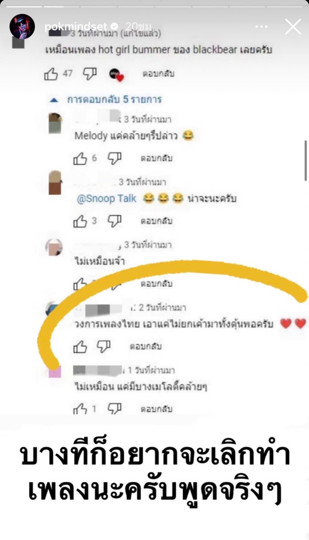 จากนั้น ป๊อก ก็ได้โพสต์ข้อความผ่านไอจีสตอรี่ด้วยความน้อยใจ และยอมรับว่า ท้อมากที่มาเจอคอมเมนต์แบบนี้ จนอยากจะหายไปไกลๆ เพราะที่ผ่านมา ทำงานมาด้วยตัวเองตลอด เพลงดังบ้างไม่ดังบ้าง แต่มันเป็นสิ่งที่เลี้ยงดูครอบครัวและทีมงานมาตลอด