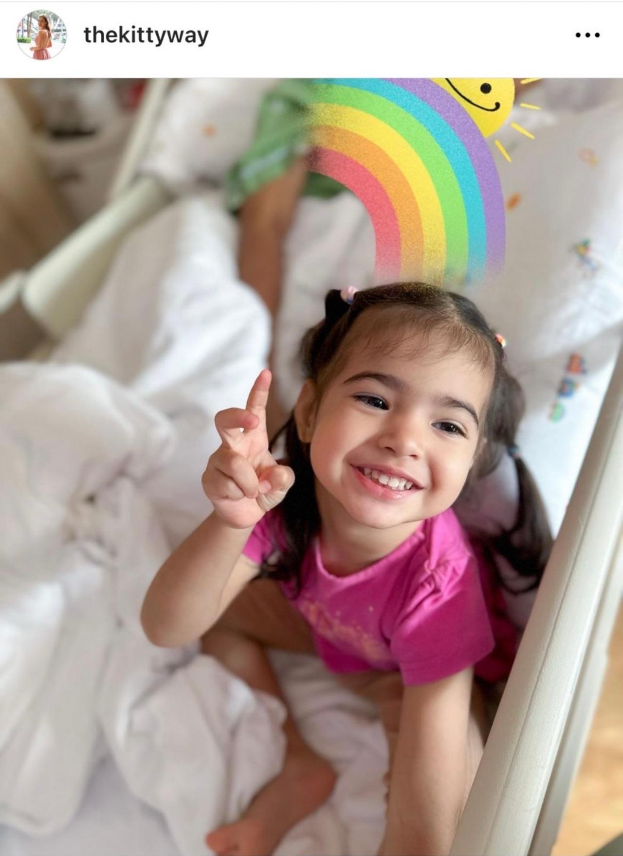 ล่าสุด คิตตี้ ได้โพสต์ภาพลูกสาว น้องวาเลนติน่า ที่มาให้กำลังใจคุณพ่ออยู่ข้างเตียงคนไข้ สาวน้อยมีรอยยิ้มที่สดใส ไม่งอแงแต่อย่างใด ซึ่ง คิตตี้ ได้เขียนข้อความว่า "Bringing Rainbows and Sunshine to Papa's room. We are trying our best for you every day na.