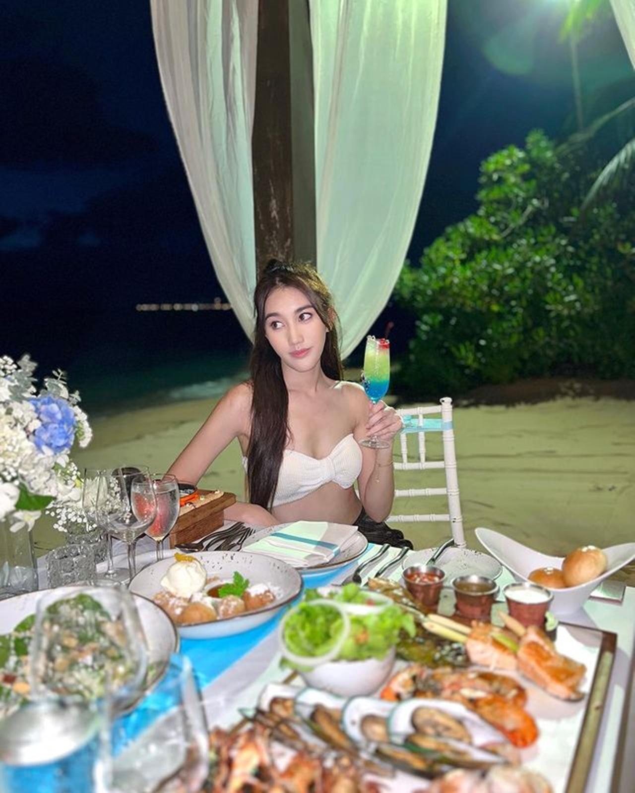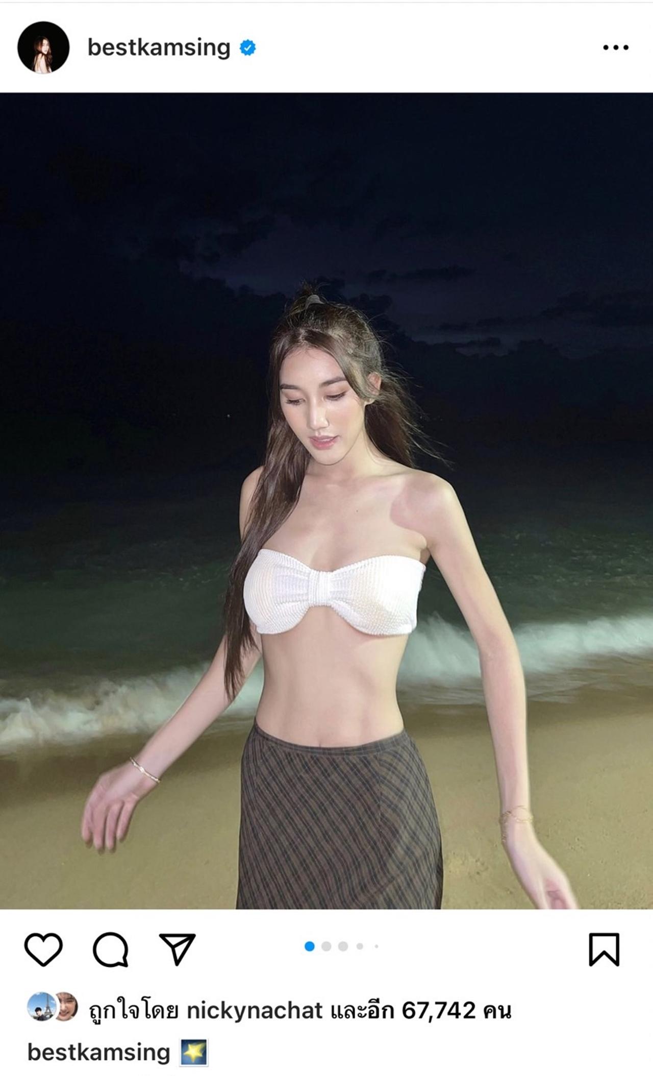 ล่าสุด เบสท์ ได้โพสต์ภาพของตัวเองที่ถ่ายอยู่ริมทะเล ด้วยการใส่เกาะอกสีขาวโชว์เนินอกขาวๆ ตูมๆ พร้อมกระโปรงรัดรูปพลิ้วแบบสุดๆ ตามลมทะเล และกำลังดินเนอร์สุดโรแมนติกเสพบรรยากาศธรรมชาติที่เต็มไปด้วยความสุข พร้อมแคปชั่นเป็นอีโมจิรูปดาวตก