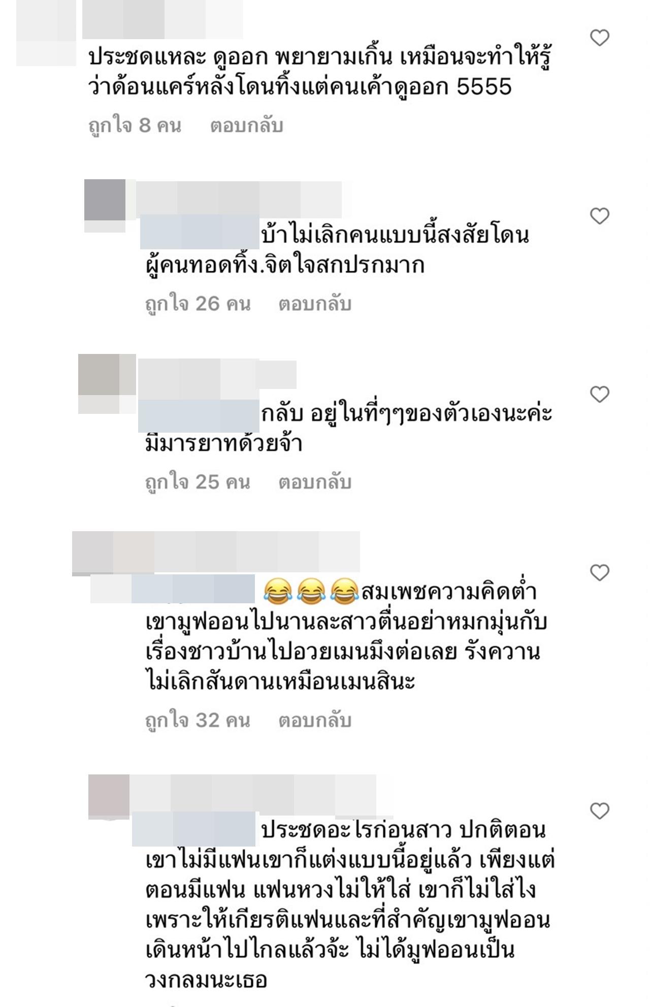 บ้าไม่เลิกคนแบบนี้ สงสัยโดนผู้คนทอดทิ้ง จิตใจสกปรกมาก, อยู่ในที่ๆๆ ของตัวเองนะคะ มีมารยาทด้วยจ้า, สมเพชความคิดต่ำ เขามูฟออนไปนานละสาว ตื่น อย่าหมกมุ่นกับเรื่องชาวบ้านไปอวยเมนมึงต่อเลย รังควานไม่เลิก สันดานเหมือนเมนสินะ, ประชดอะไรก่อนสาว ปกติตอนเขาไม่มีแฟน เขาก็แต่งแบบนี้อยู่แล้ว เพียงแต่ตอนมีแฟน แฟนหวงไม่ให้ใส่ เขาก็ไม่ใส่ไง เพราะให้เกียรติแฟน และที่สำคัญเขามูฟออนเดินหน้าไปไกลแล้วจ้ะ ไม่ได้มูฟออนเป็นวงกลมนะเธอ, สมเพชความคิดคุณจัง น้องเขาจะประชดเพื่อไรคะ ในเมื่อเขามีความสุขมากๆๆๆๆ ที่หลุดพ้น แถมได้ทำอะไรดีๆ ตั้งหลายอย่างที่อยากทำ และยังมีแต่คนดีๆ เข้ามาในชีวิตอีกเยอะ อุ้ปปปป เป็นต้น.