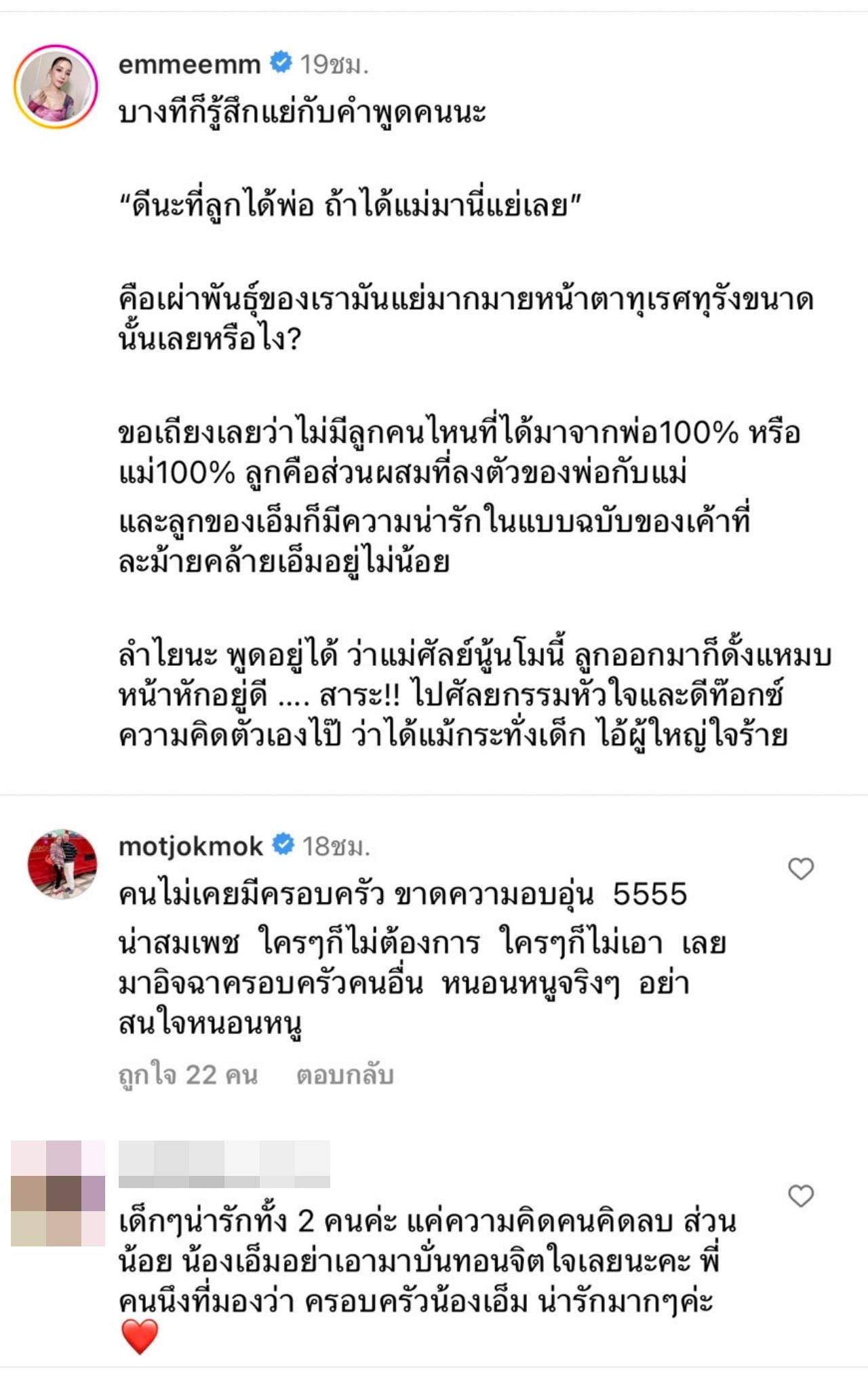ในขณะที่แฟนๆ ที่ติดตามก็ได้เข้ามาให้กำลังใจเอ็มกันจำนวนมาก ซึ่งทุกคนต่างก็พูดให้กำลังใจเอ็ม ชมลูกสาว 2 คนน่ารัก อย่าไปสนใจคอมเมนต์แย่ๆ เลย ที่สำคัญกว่าหน้าตาคือ การมีจิตใจที่ดีนั่นเอง.