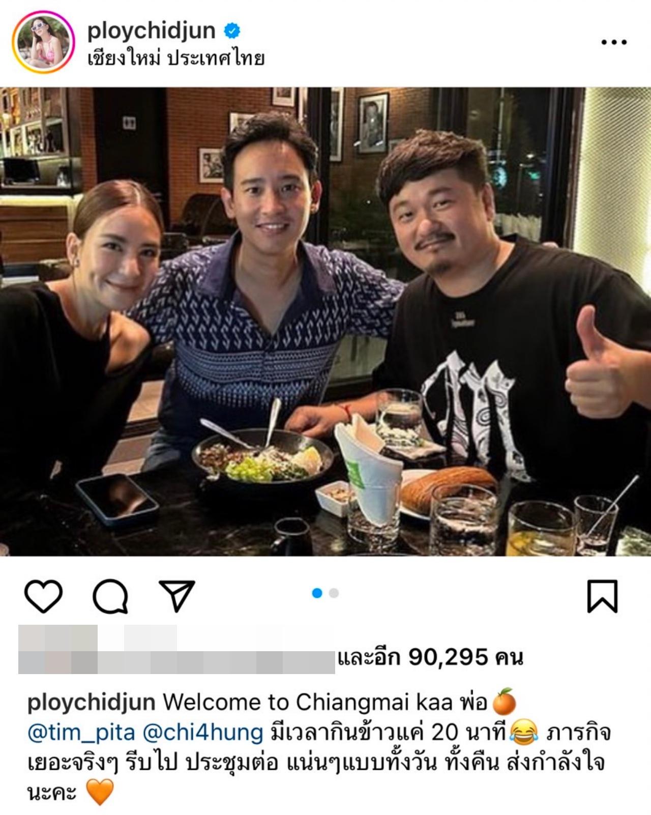 ล่าสุดทำเอาแฟนๆ กองเชียร์พ่อส้มลุ้นหนักมาก เมื่อ พลอย ชิดจันทร์ ได้โพสต์ภาพนัดทานข้าวกับ ทิม พิธา ลิ้มเจริญรัตน์ ว่าที่นายกรัฐมนตรี หลังจากที่ ทิม ได้เดินทางมาเชียงใหม่ พร้อมเขียนแคปชั่นว่า