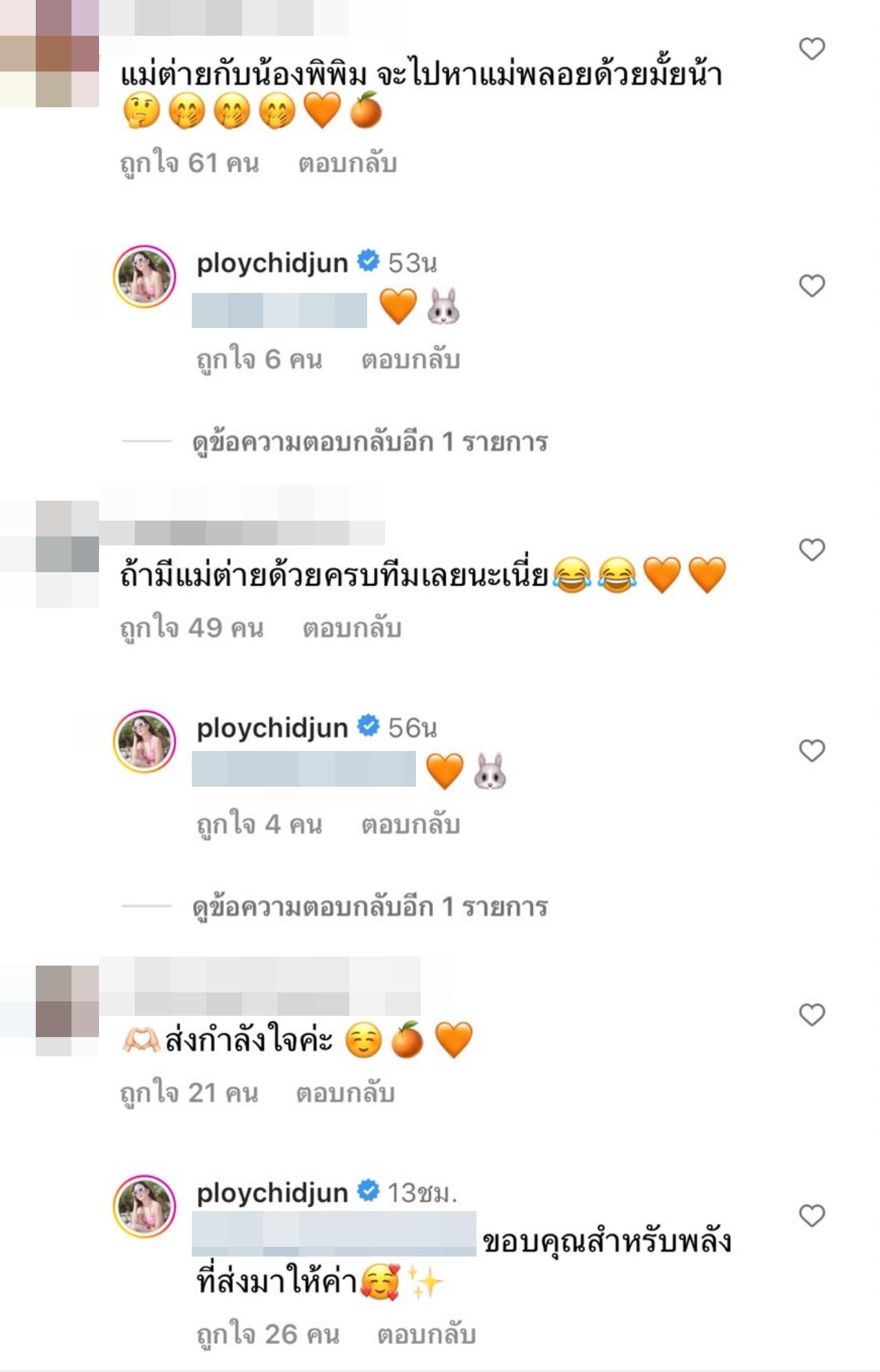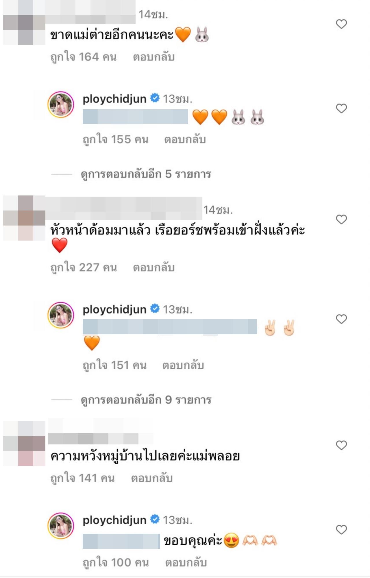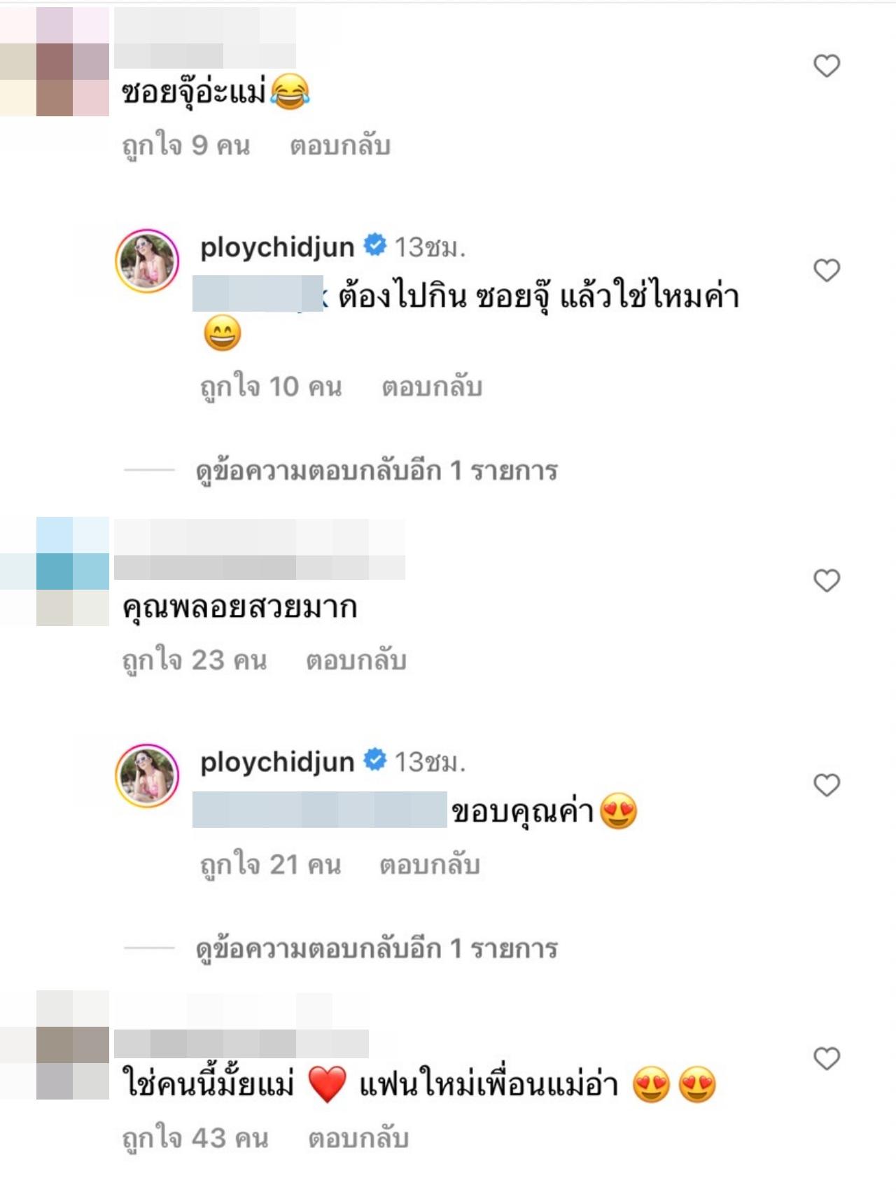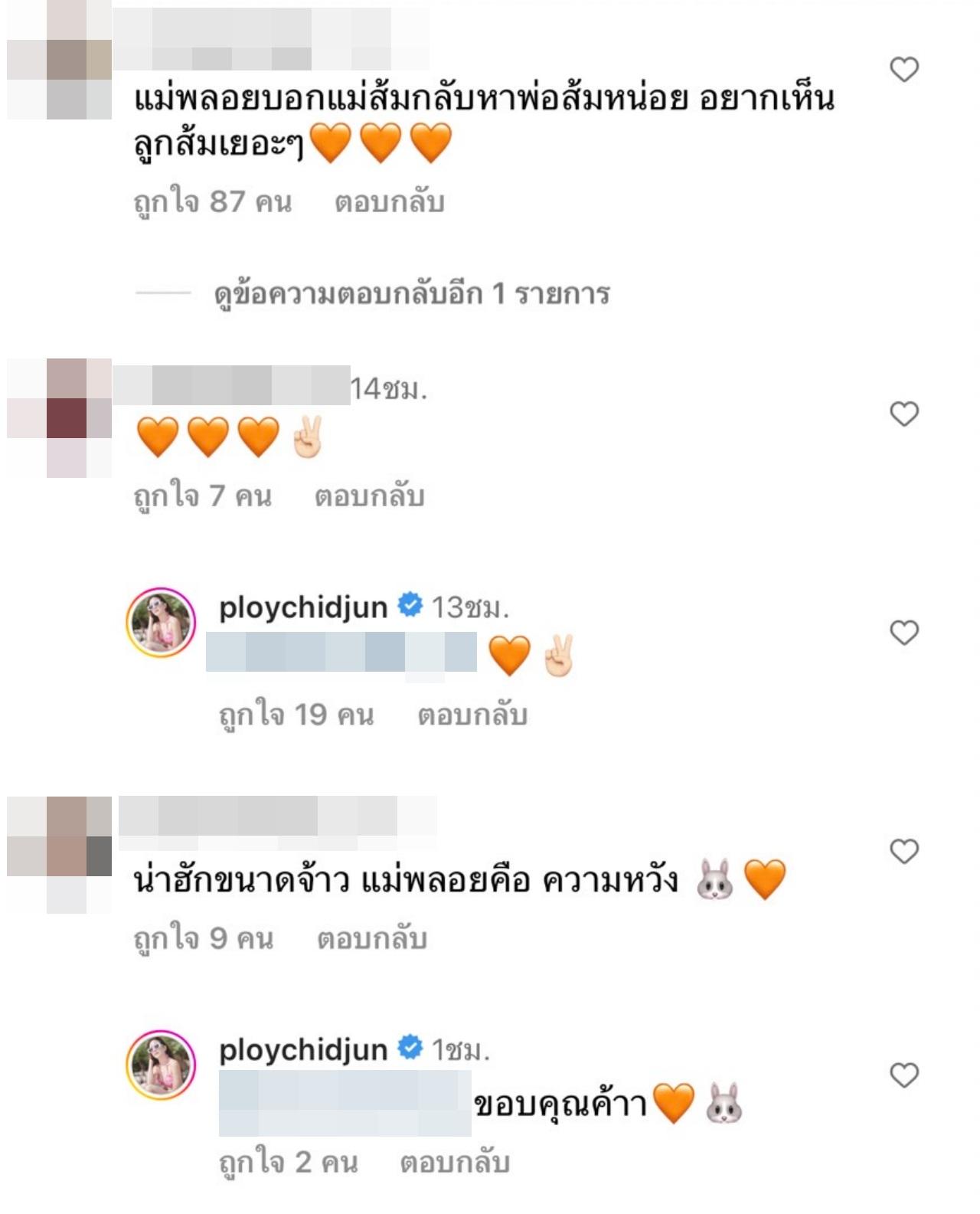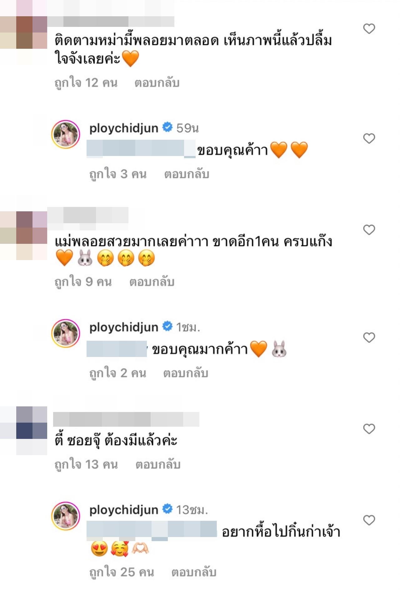 ด้านแฟนๆ ที่ติดตามต่างเข้ามากรี๊ดกร๊าดกันจำนวนมาก พร้อมคอมเมนต์เชียร์กันสนั่น บอกว่า หัวหน้าด้อมมาแล้ว เรือยอร์ชพร้อมเข้าฝั่งแล้วค่ะ, ขาดแม่ต่ายอีกคนนะคะ, ความหวังหมู่บ้านไปเลยค่ะแม่พลอย, ฝากเชียร์แม่ต่ายหน่อยค่า, แม่ต่ายกับน้องพิพิม จะไปหาแม่พลอยด้วยมั้ยน้า, กีสๆๆแม่พลอย กัปตันเรือพ่อทิมแม่ต่าย , ใช่คนนี้มั้ยแม่ แฟนใหม่เพื่อนแม่อ่า, ถ้ามีแม่ต่ายด้วยครบทีมเลยนะเนี่ย, แม่พลอยสวยมากเลยค่าาา ขาดอีก1คน ครบแก๊ง, ติดตามหม่ามี๊พลอยมาตลอด เห็นภาพนี้แล้วปลื้มใจจังเลยค่ะ เป็นต้น.