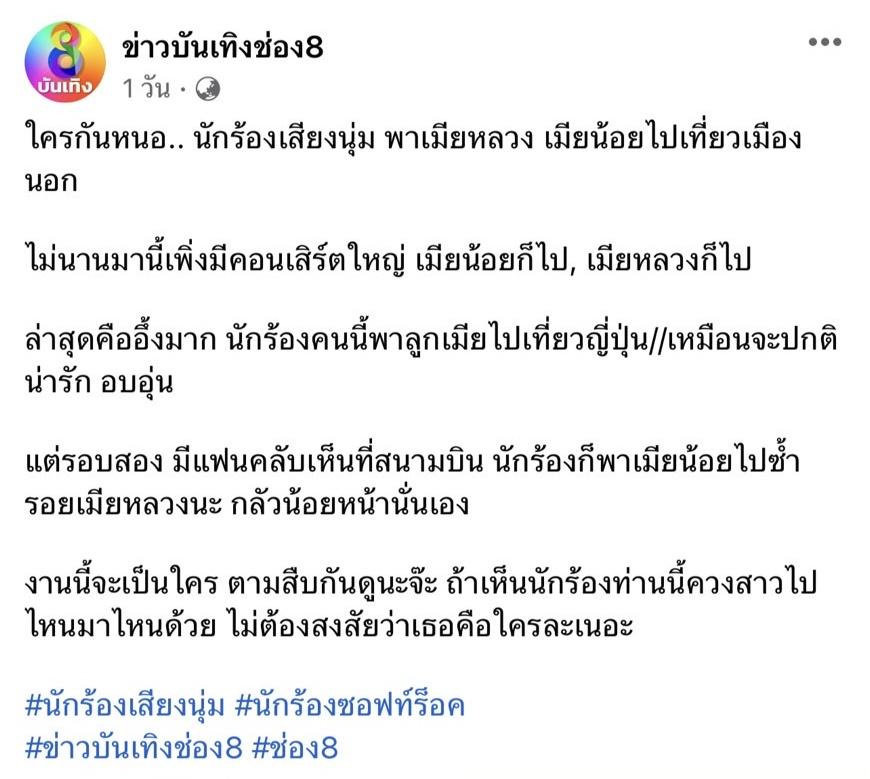 จากกรณีที่เพจ เจ๊มอย 108 และ ข่าวบันเทิงช่อง 8 ได้โพสต์ถึงเรื่องราวนักร้องเสียงนุ่ม นักร้องซอฟต์ร็อก พาเมียหลวงเมียน้อยไปเที่ยวเมืองนอก ล่าสุดคืออึ้งมาก นักร้องคนนี้พาลูกเมียไปเที่ยวญี่ปุ่น เหมือนจะปกติ น่ารัก อบอุ่น แต่รอบสอง มีแฟนคลับเห็นที่สนามบิน นักร้องก็พาเมียน้อยไปซ้ำรอยเมียหลวง จนกลายเป็นกระแสวิพากษ์วิจารณ์อย่างหนักในโซเชียล