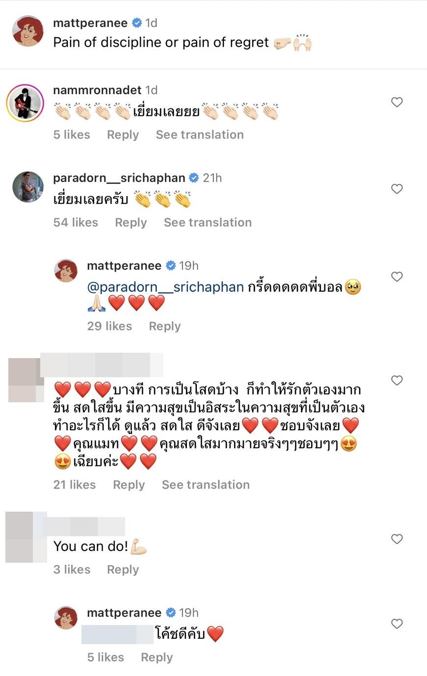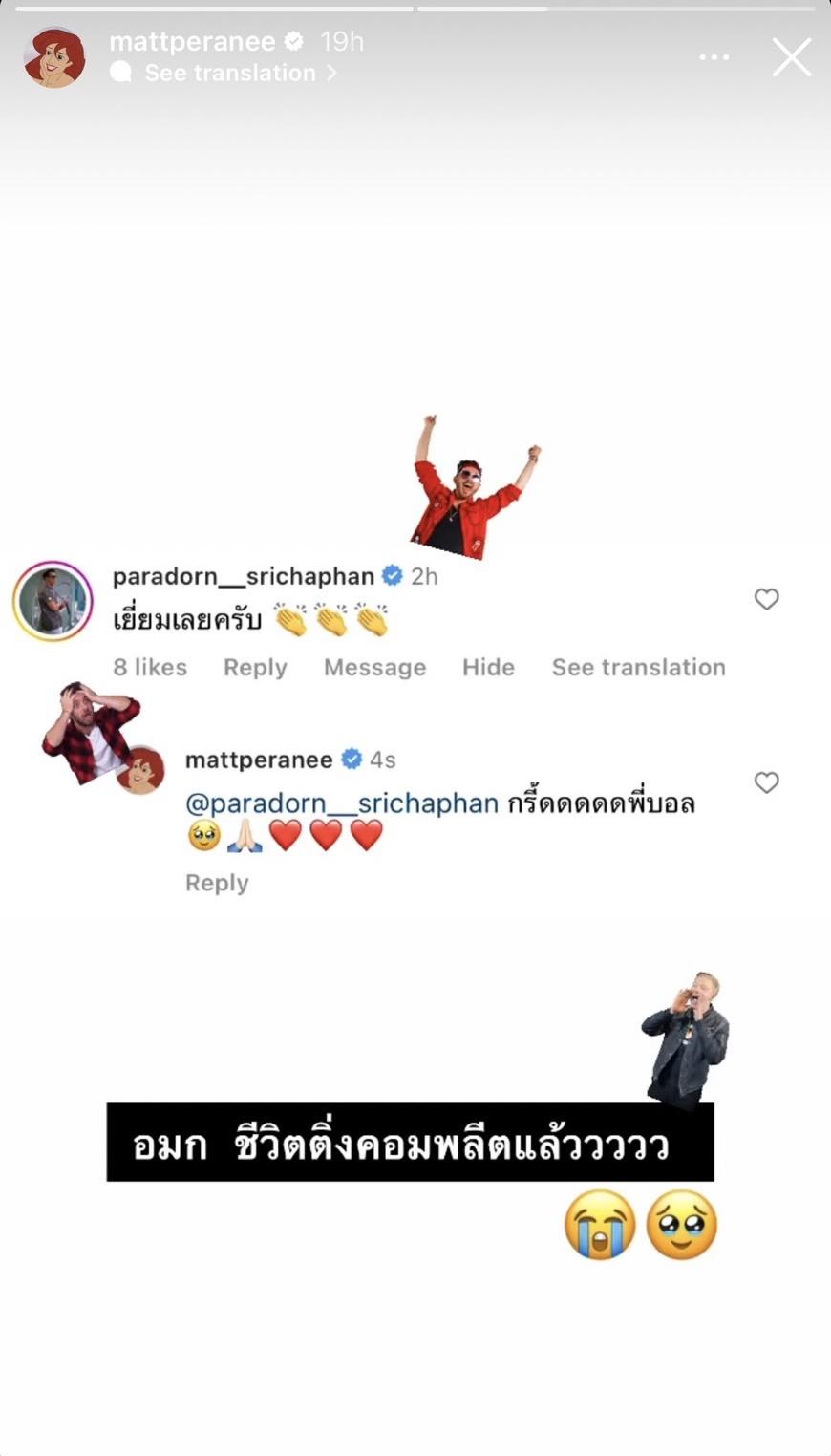 แต่ที่ทำเอาแมทเป็นปลื้มดีใจสุดๆ เมื่ออดีตนักเทนนิสทีมชาติไทยอย่าง บอล ภราดร ศรีชาพันธุ์ เข้ามาคอมเมนต์ใต้คลิปว่า “เยี่ยมเลยครับ” ทำเอาแมทรีบเข้ามาคอมเมนต์ตอบกลับทันทีว่า “กรี๊ดดดดดพี่บอล” ก่อนจะแคปภาพข้อความลงในไอจีสตอรี่ พร้อมทั้งเขียนข้อความว่า “อมก ชีวิตติ่งคอมพลีตแล้ววววว”.