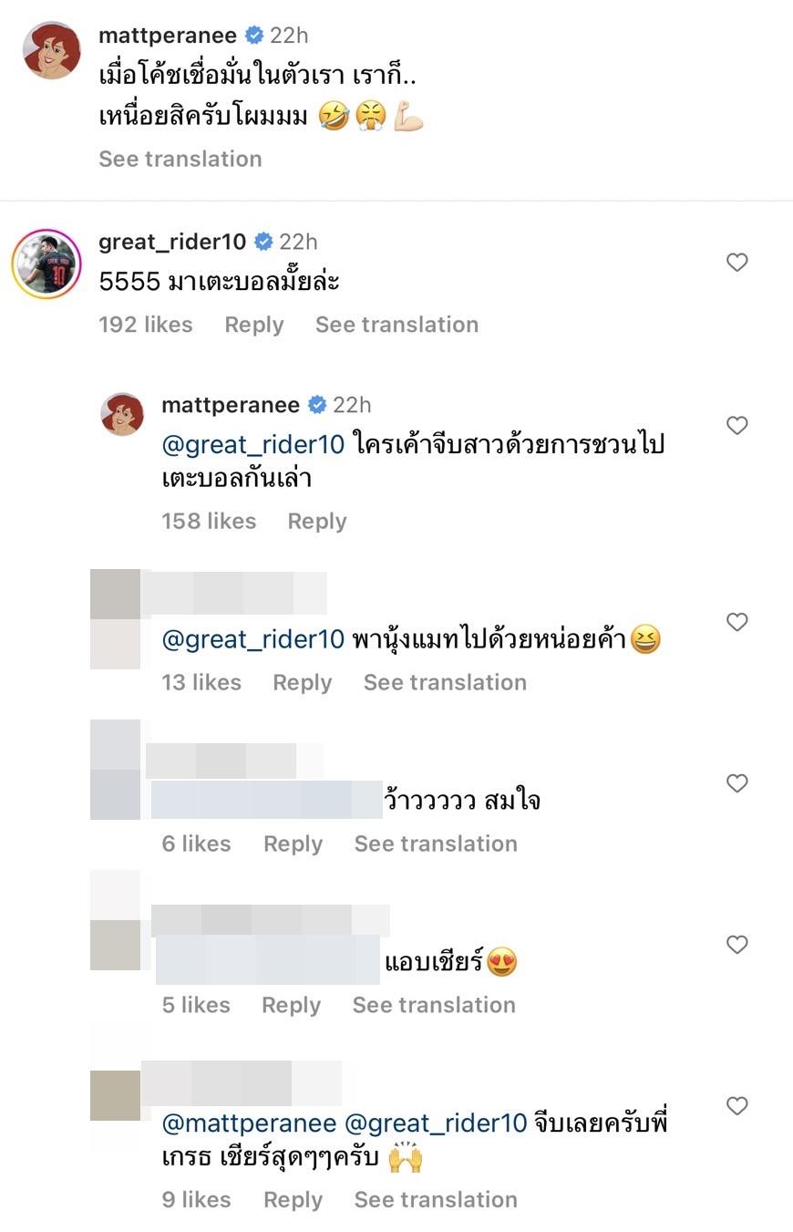 แต่ที่ทำให้หลายคนจับตามอง เห็นจะเป็นคอมเมนต์จากคู่จิ้นอย่างเกรท ที่เข้ามาคอมเมนต์แซวแมทว่า “5555 มาเตะบอลมั๊ยล่ะ” ส่วนคำตอบจากแมทก็ทำเอาแฟนๆ จิ้นหนัก เพราะเจ้าตัวตอบกลับว่า “ใครเค้าจีบสาวด้วยการชวนไปเตะบอลกันเล่า” ทำเอาแฟนๆ แห่กดไลค์พร้อมทั้งคอมเมนต์เชียร์คู่นี้แบบรัวๆ เลยทีเดียว.