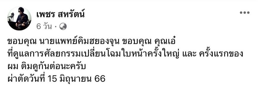โดยในเฟซบุ๊ก เพชร สหรัตน์ ก็ได้โพสต์ภาพอัปเดตล่าสุดหลังผ่าตัดศัลยกรรมครั้งใหญ่ ซึ่งในภาพยังต้องนอนพักอยู่บนเตียง ใบหน้ายังบวมหลังผ่าตัด มีผ้าพันแผลและที่รัดหน้า พร้อมทั้งเขียนข้อความว่า “ขอบพระคุณทุกความห่วงใยนะครับ ผลผ่าตัดผมปลอดภัยดีครับ ตอนนี้อยู่ในระยะพักฟื้นครับ”