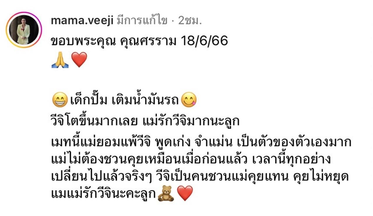 "ขอบพระคุณ คุณศรราม 18/6/66 เด็กปั๊ม เติมน้ำมันรถ วีจิโตขึ้นมากเลย แม่รักวีจิมากนะลูก เมทนี้แม่ยอมแพ้วีจิ พูดเก่ง จำแม่น เป็นตัวของตัวเองมาก แม่ไม่ต้องชวนคุยเหมือนเมื่อก่อนแล้ว เวลานี้ทุกอย่างเปลี่ยนไปแล้วจริงๆ วีจิเป็นคนชวนแม่คุยแทน คุยไม่หยุด แมแม่รักวีจินะคะลูก"