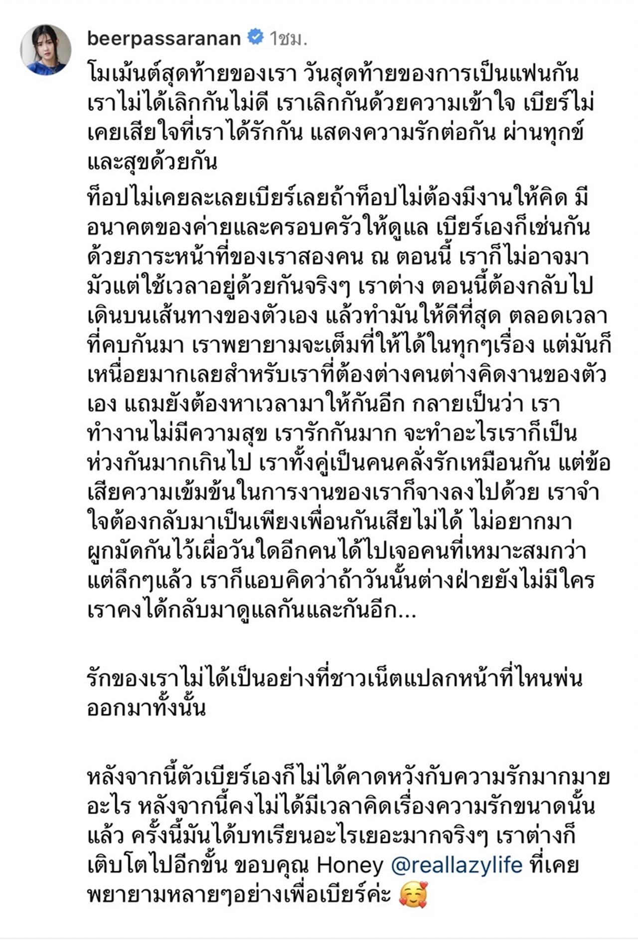 ล่าสุด เบียร์ ก็ได้โพสต์ภาพโมเมนต์สุดท้ายก่อนเลิก ท็อป โดยบอกว่า ไม่ได้เลิกกันไม่ดี แต่เลิกกันด้วยความเข้าใจ และไม่ได้เป็นอย่างที่ชาวเน็ตคิด