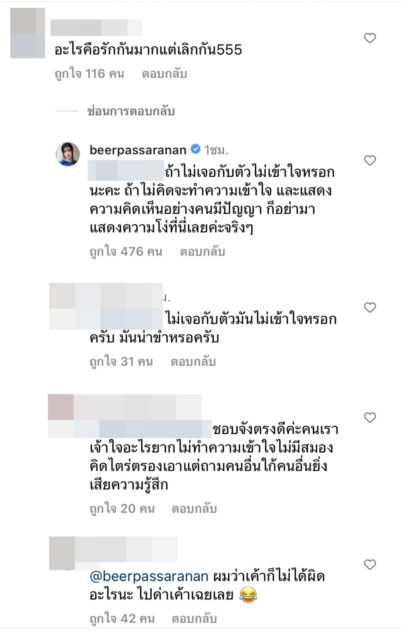 หลังจากที่ เบียร์ ได้โพสต์ข้อความดังกล่าว ได้มีคนเข้ามาคอมเมนต์ว่า "คืออะไรรักกันมากแต่เลิกกัน555" ด้าน เบียร์ ก็ได้ตอบกลับไปว่า "ถ้าไม่เจอกับตัวไม่เข้าใจหรอกนะคะ ถ้าไม่คิดจะทำความเข้าใจ และแสดงความคิดเห็นอย่างคนมีปัญญา ก็อย่ามาแสดงความโง่ที่นี่เลยค่ะจริงๆ".