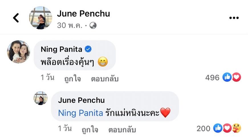 ซึ่ง หนิง ปณิตา ก็ได้เข้ามาคอมเมนต์ใต้โพสต์ดังกล่าวของจูนว่า “พล็อตเรื่องคุ้นๆ” ก่อนที่ จูน เพ็ญชุลี จะตอบกลับว่า “รักแม่หนิงนะคะ” หลังจากนั้นก็มีแฟนๆ แห่กดไลค์ข้อความนับร้อยคนเลยทีเดียว.