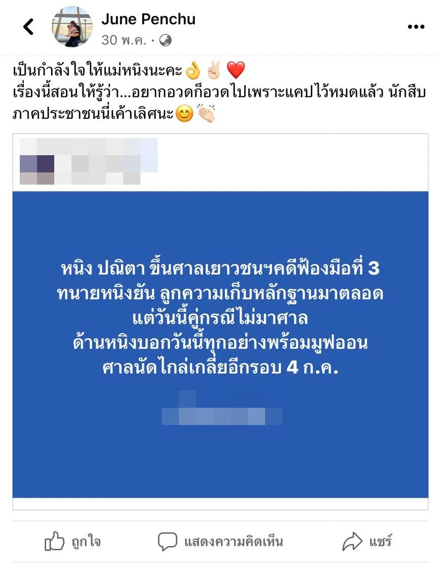 และก่อนที่ หนุ่ม กะลา จะไลฟ์สดนั้น ชาวเน็ตก็เข้าไปส่องโพสต์ของ จูน เพ็ญชุลี ภรรยาของ หนุ่ม กะลา ที่พักหลังๆ มักจะโพสต์เรื่องเมียหลวงเมียน้อย ก่อนจะแชร์โพสต์จากเพจข่าวเรื่องที่นางร้าย-ผู้จัดสาวเก่ง หนิง ปณิตา ขึ้นศาลเยาวชนฯ คดีฟ้องมือที่ 3 พร้อมทั้งเขียนข้อความให้กำลังใจหนิงไว้ว่า “เป็นกำลังใจให้แม่หนิงนะคะ เรื่องนี้สอนให้รู้ว่า…อยากอวดก็อวดไปเพราะแคปไว้หมดแล้ว นักสืบภาคประชาชนนี่เค้าเลิศนะ”