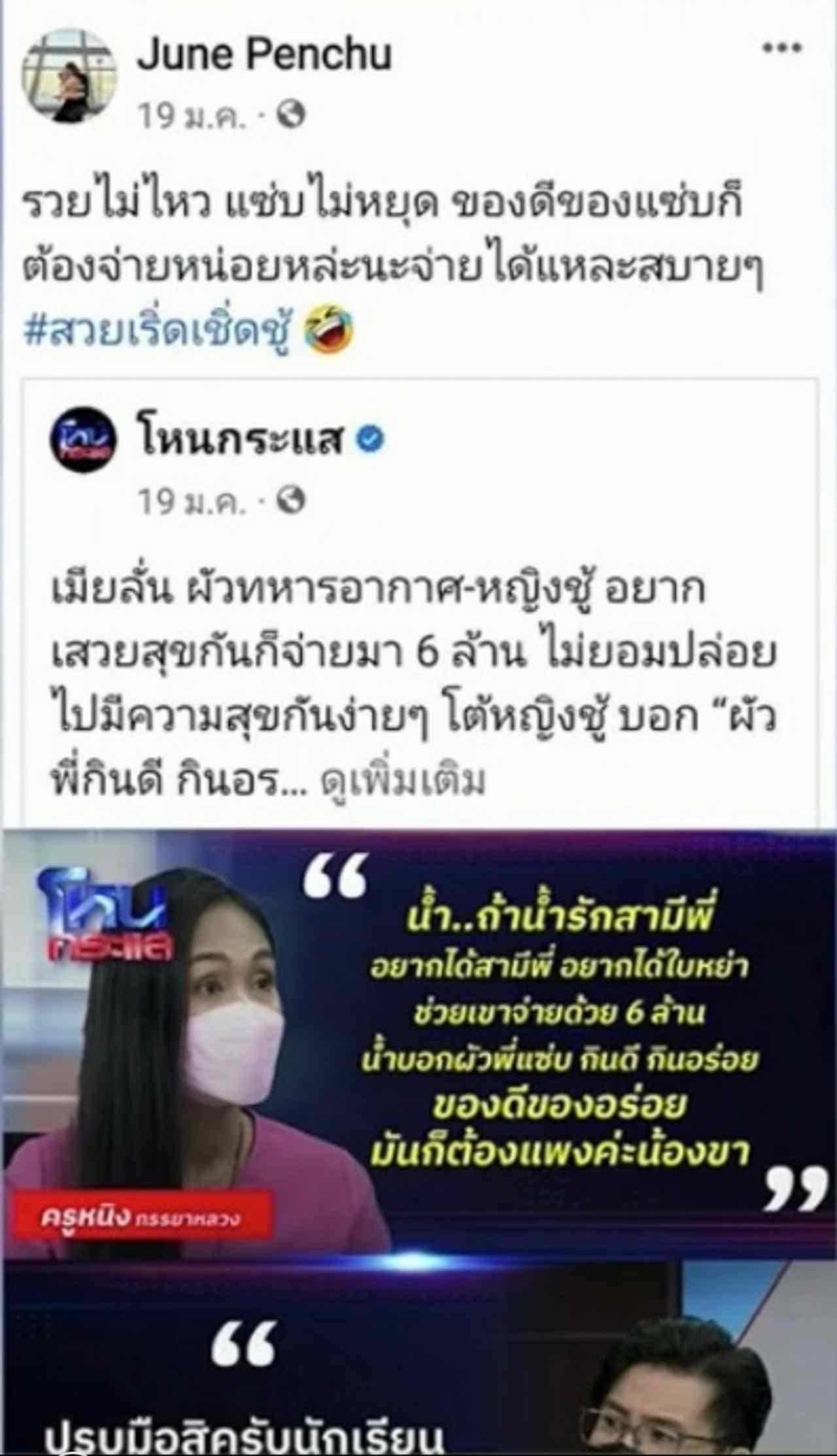 และก็ได้เห็นว่าเจ้าตัวนั้นเคยแชร์โพสต์ข่าวของการฟ้องชู้เอาไว้อีกด้วย โดยจูนได้เขียนแคปชั่นเอาไว้ว่า “รวยไม่ไหว แซ่บไม่หยุด ของดีของแซ่บก็ต้องจ่ายหน่อยล่ะนะ จ่ายได้แหละสบายๆ #สวยเริดเชิดชู้”