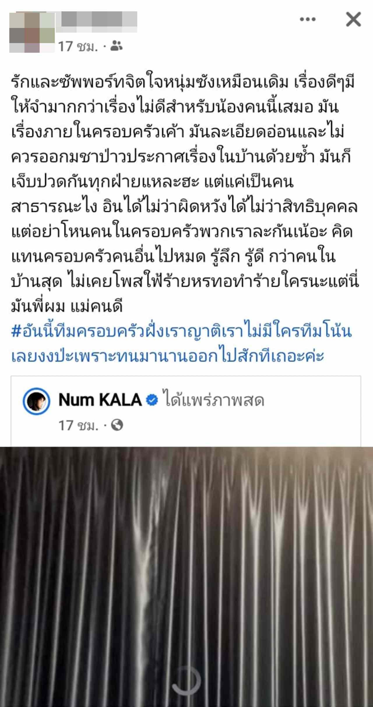 มันก็เจ็บปวดกันทุกฝ่ายแหละฮะ แต่แค่เป็นคนสาธารณะไง อินได้ไม่ว่า ผิดหวังได้ไม่ว่าสิทธิบุคคล แต่อย่าโหนคนในครอบครัวพวกเราละกันเนอะ คิดแทนครอบครัวคนอื่นไปหมด รู้ลึก รู้ดี กว่าคนในบ้านสุด ไม่เคยโพสต์ใส่ร้ายหรือทำร้ายใครนะ แต่นี่มันพี่ผม แม่คนดี “อันนี้ทีมครอบครัวฝั่งเราญาติเราไม่มีใครทีมโน้นเลยงงปะ เพราะทนมานานออกไปสักทีเถอะค่ะ”