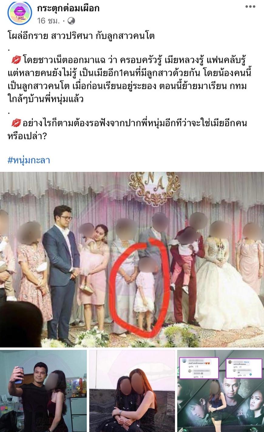 พร้อมทั้งเขียนข้อความว่า “โผล่อีกราย สาวปริศนา กับลูกสาวคนโต โดยชาวเน็ตออกมาแฉ ว่า ครอบครัวรู้ เมียหลวงรู้ แฟนคลับรู้ แต่หลายคนยังไม่รู้ เป็นเมียอีก 1 คนที่มีลูกสาวด้วยกัน โดยน้องคนนี้เป็นลูกสาวคนโต เมื่อก่อนเรียนอยู่ระยอง ตอนนี้ย้ายมาเรียน กทม. ใกล้ๆ บ้านพี่หนุ่มแล้ว อย่างไรก็ตามต้องรอฟังจากปากพี่หนุ่มอีกทีว่าจะใช่เมียอีกคนหรือเปล่า? #หนุ่มกะลา”