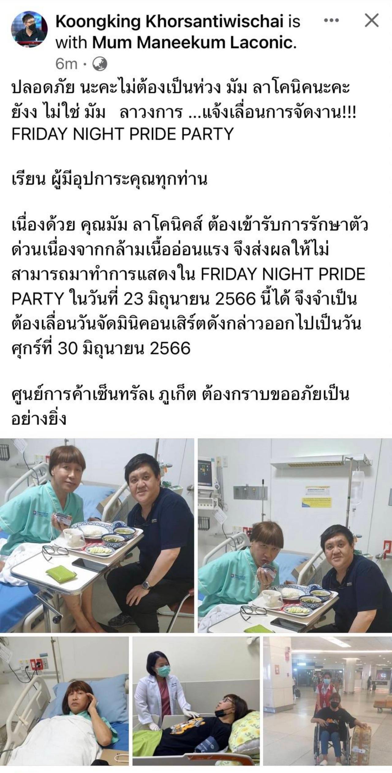 เรียน ผู้มีอุปการะคุณทุกท่าน เนื่องด้วย คุณมัม ลาโคนิคส์ ต้องเข้ารับการรักษาตัว ด่วนเนื่องจากกล้ามเนื้ออ่อนแรง จึงส่งผลให้ไม่สามารถมาทำการแสดงใน FRIDAY NIGHT PRIDE PARTY ในวันที่ 23 มิถุนายน 2566 นี้ได้ จึงจำเป็นต้องเลื่อนวันจัดมินิคอนเสิร์ตดังกล่าวออกไปเป็นวันศุกร์ที่ 30 มิถุนายน 2566 ศูนย์การค้าเชนทรัล ภูเก็ต ต้องกราบขออภัยเป็นอย่างยิ่ง"