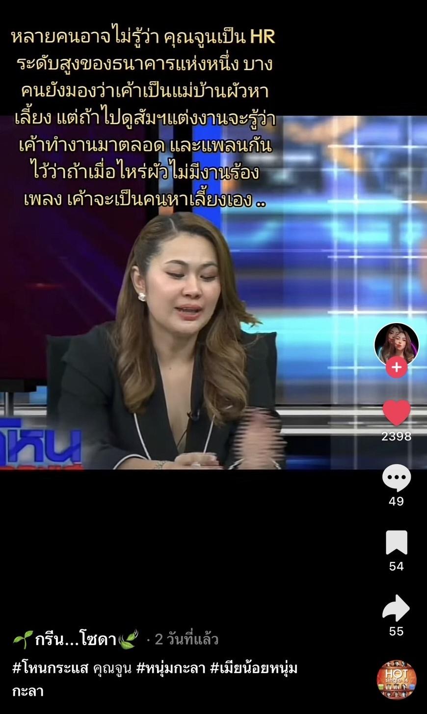 ล่าสุด มีผู้ใช้ TikTok ที่ออกมาเผยเรื่องราวของจูน เพ็ญชุลี ไว้ว่า หลายคนอาจไม่รู้ว่า คุณจูนเป็น HR ระดับสูงของธนาคารแห่งหนึ่ง บางคนยังมองว่าเค้าเป็นแม่บ้านผัวหาเลี้ยง แต่ถ้าไปดูสัมฯ แต่งงานจะรู้ว่าเขาทำงานมาตลอด และแพลนกันไว้ว่าถ้าเมื่อไรผัวไม่มีงานร้องเพลง เขาจะเป็นคนหาเลี้ยงเอง (ชมคลิป)