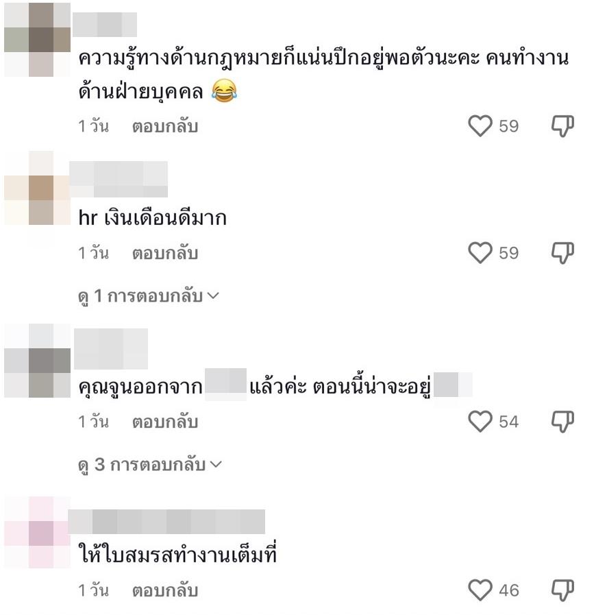 นอกจากนี้ ยังมีคนที่บอกว่า ฐานเงินเดือนตำแหน่ง HR จบใหม่เริ่มต้น 18,000-30,000 ถ้าเป็นเมเนเจอร์ 40,000 ขึ้นไปจนถึง 150,000 เลย กรณีคุณจูน เป็น HR ระดับสูง เงินเดือนไม่น้อยแน่นอน หลังจากนั้นก็มีชาวเน็ตรายหนึ่งแสดงความคิดเห็นว่า “เมื่อก่อนทำงานอยู่ ... ตอนนี้อยู่ที่ ... (บริษัทยักษ์ใหญ่ของประเทศ) แล้วค่ะ” (ชมคลิป)