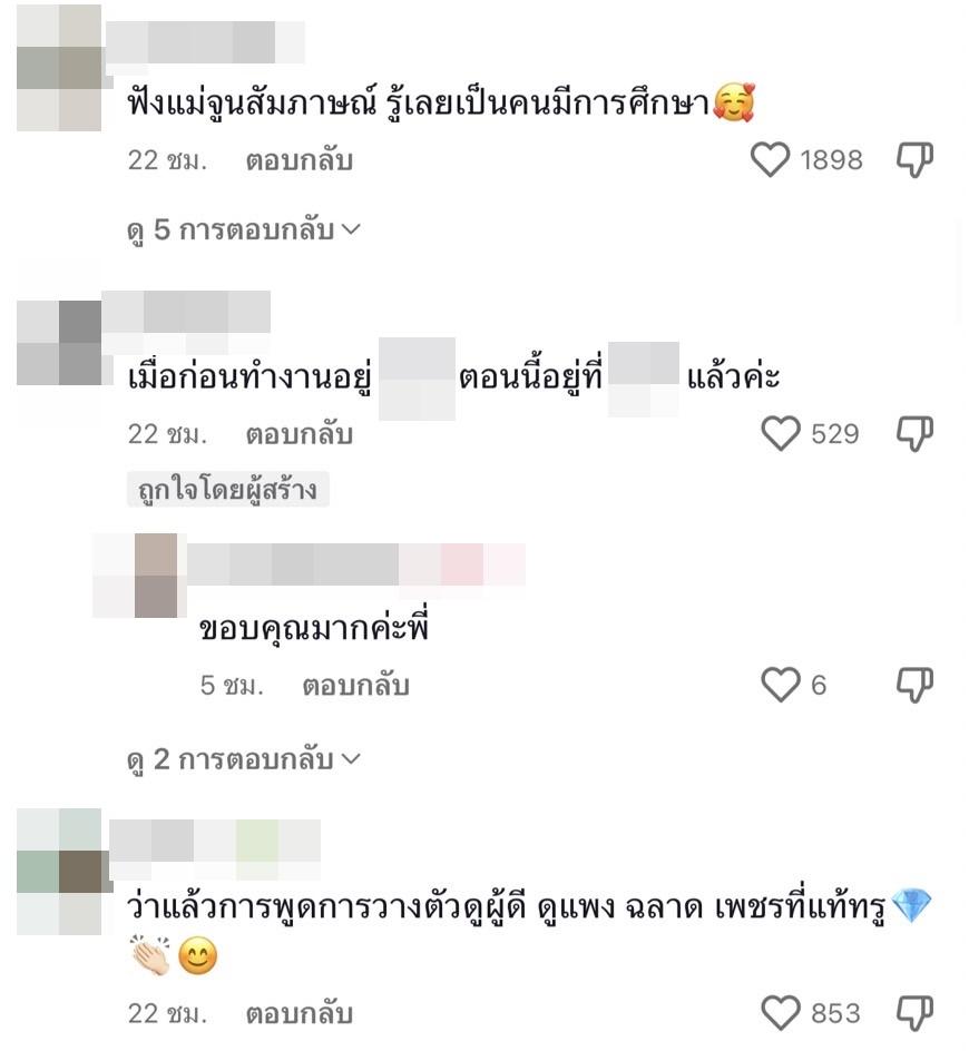 ท่ามกลางคอมเมนต์แสดงความคิดเห็น อาทิ พี่จูนความรู้ความสามารถเยอะมาก สังเกตได้จากวิธีการสนทนากับลูกรวมถึงการใช้ไทยคำอังกฤษคำ ทัศนคติวิธีการพูดการตอบคำถามคือฉลาดหัวไว คนละเกรดกับอีกคนเลย, hr ที่เงินเดือนเยอะ คือเก่งงาน เก่งคน เพราะคนไม่ใช่เครื่องจักร ซึ่งก็ยาก เราว่าคุณจูนน่าจะดูคนออก,